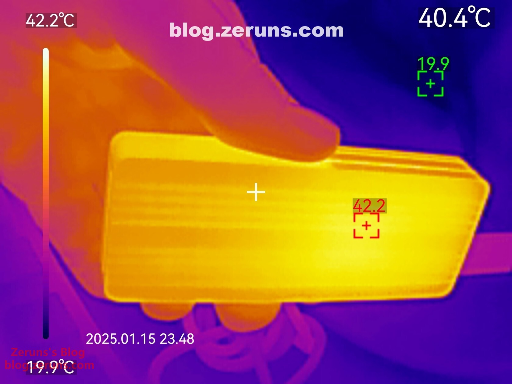 组装回去后,硬盘盒背面热成像图,读写跑满时最高温度42.2℃(环境温度20度左右)