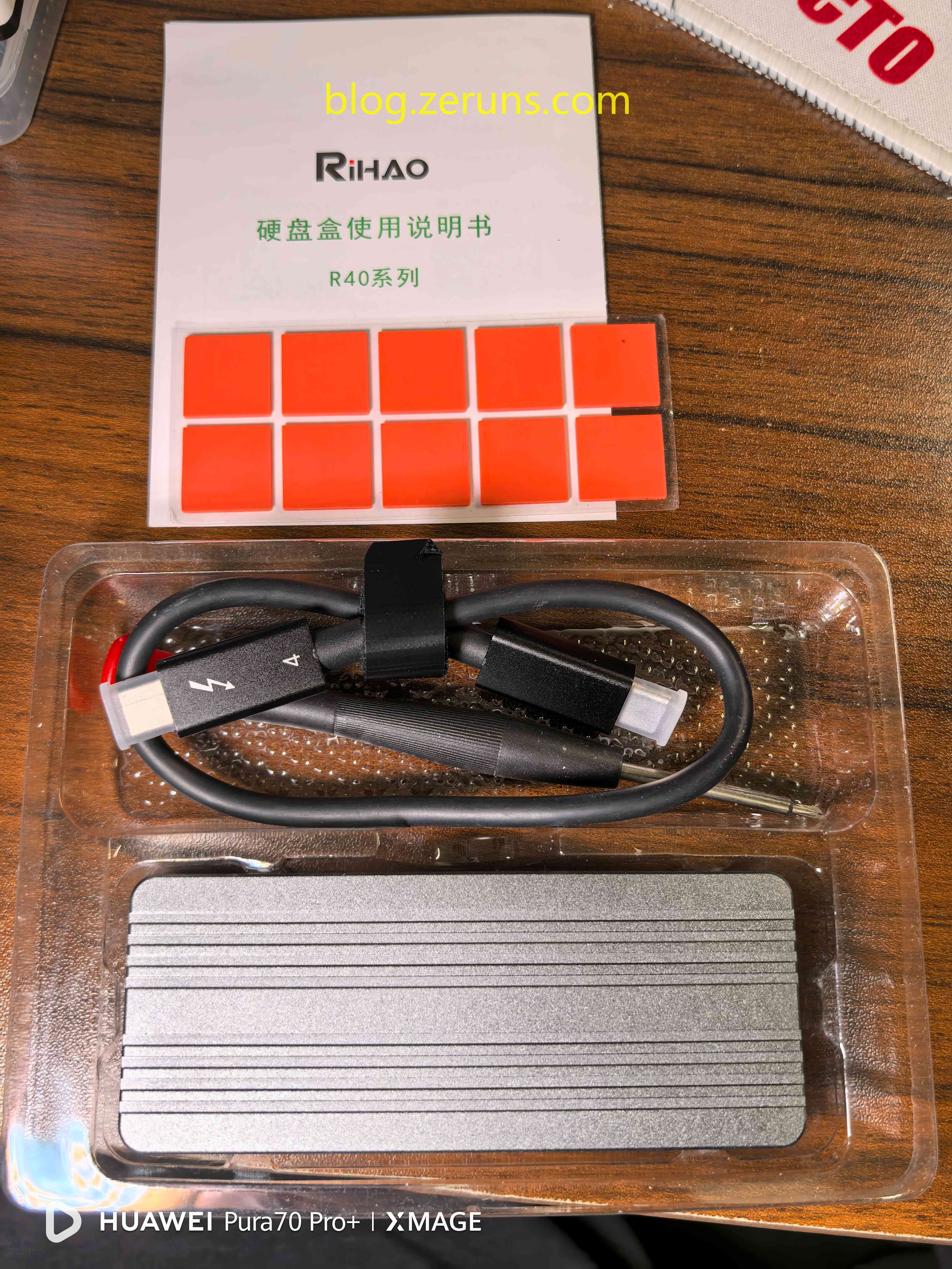 打开外包装,里面有硬盘盒、CtoC数据线、说明书、螺丝刀、导热垫