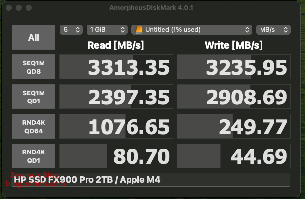 使用Mac上的 AmorphousDiskMark 4.0.1 软件测速,顺序写入速度3313.35MB/s,顺序读取3235.95MB/s,单线程4K随机读速度80.7MB/s,单线程4K随机写速度44.69MB/s。(受限硬盘盒和接口速率,跑不满硬盘的速度)