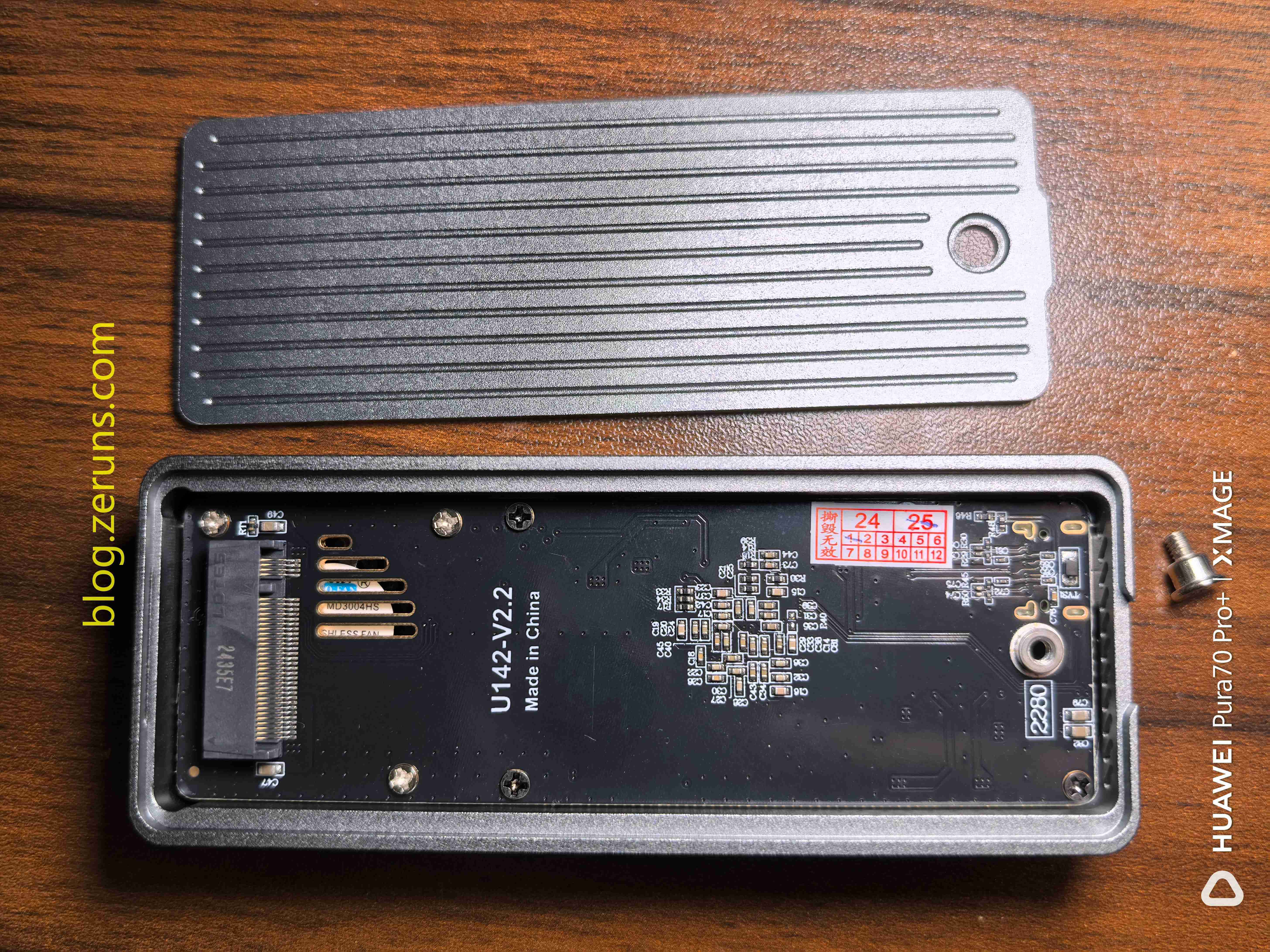 拧下螺丝,取下硬盘盒上盖,插硬盘的地方就在这,硬盘盒电路板上写着 U142-V2.2 应该是电路的版本号,固定电路板的螺丝其中一颗贴有易碎标签,可以用镊子轻轻挑开,无损拆解。