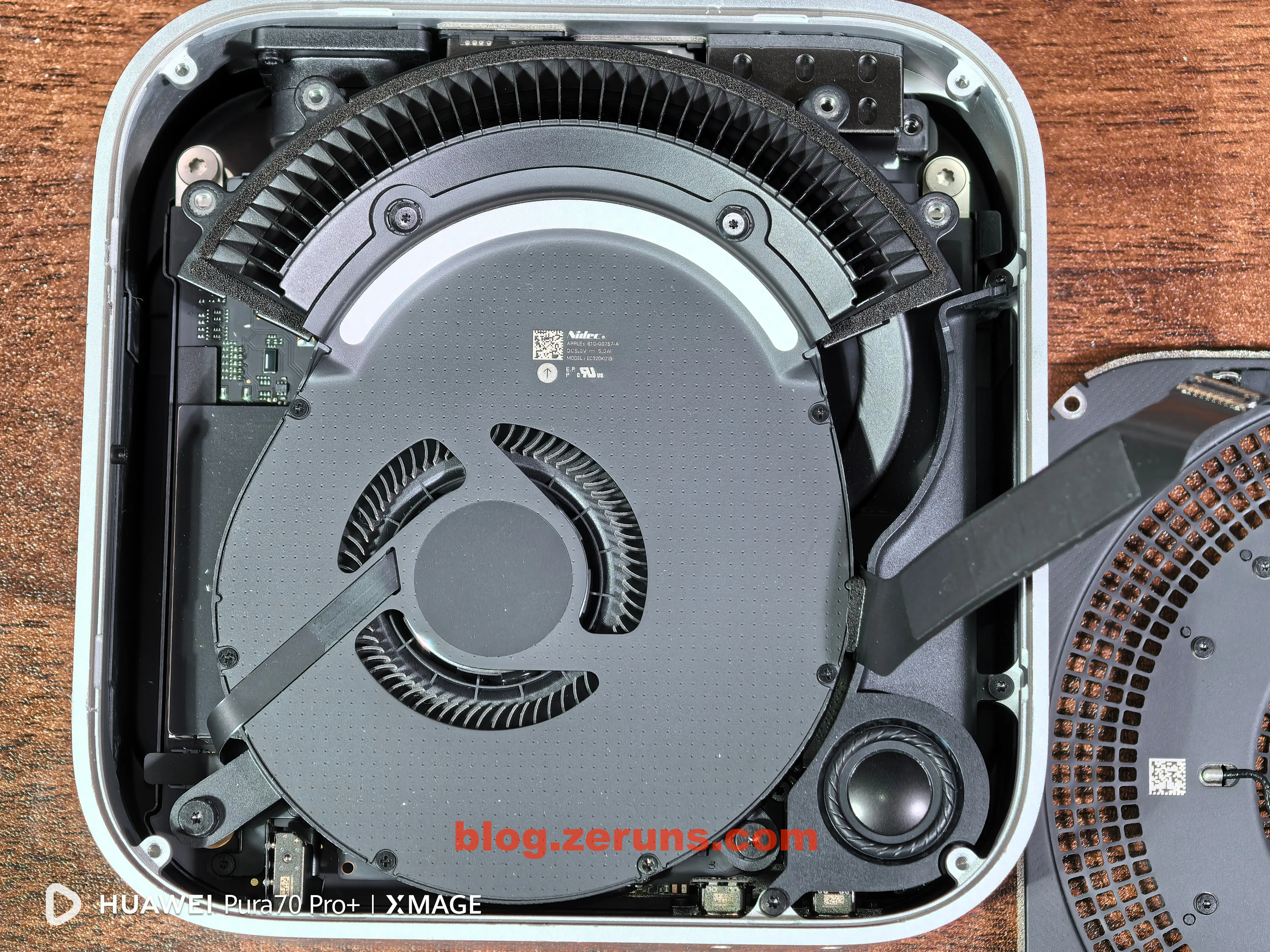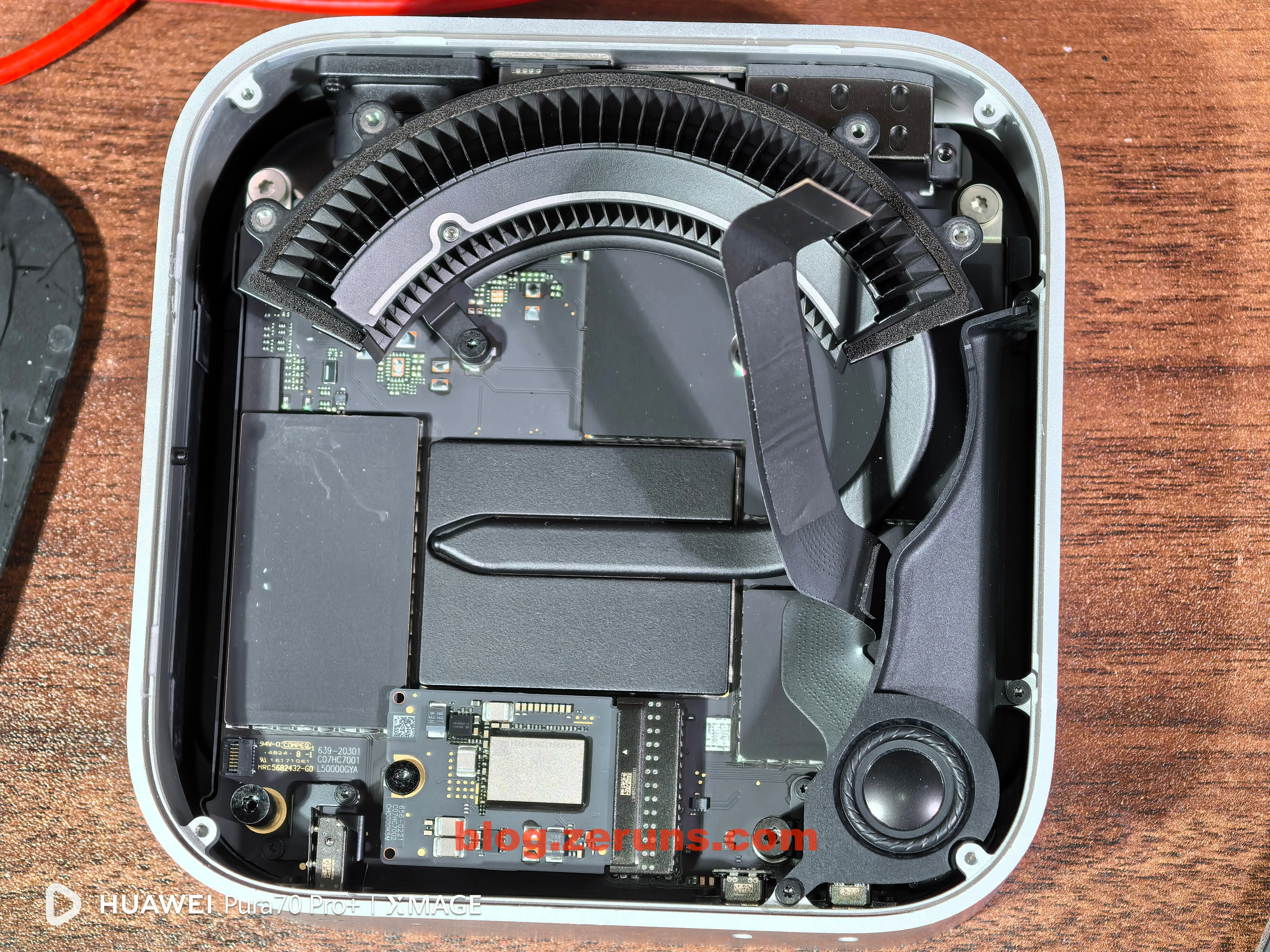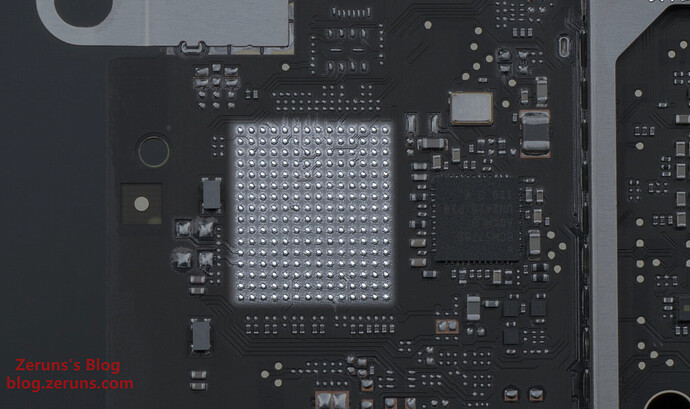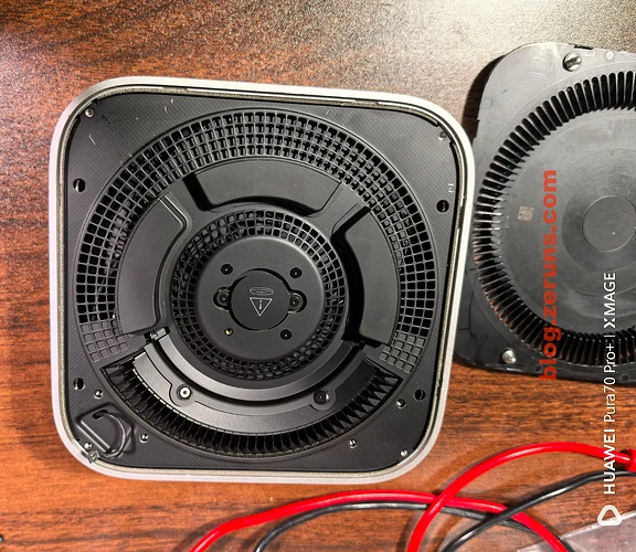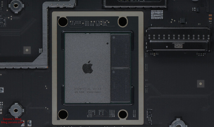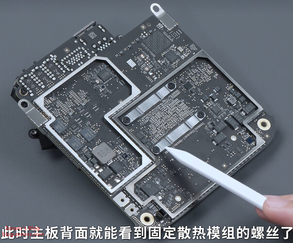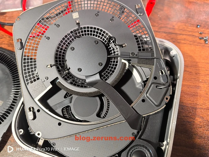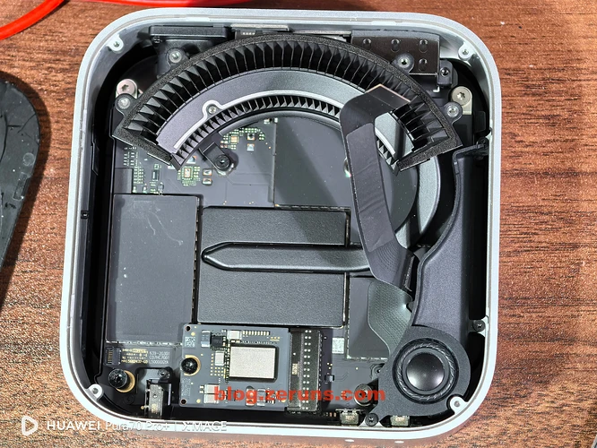 拆下散热风扇后可以看到主板,硬盘是单独的SSD硬盘小板(接口不是通用的M.2之类的,是苹果自己定制的),小板上好像没有集成主控的,就闪存颗粒,可以购买单独的硬盘小板来替换扩容,也可以拆下小板然后拆焊颗粒,更换大容量的颗粒,现在已经有单独小板卖了,也有做换颗粒扩容的服务。所以没必要买大容量的版本,直接买丐版更划算。
