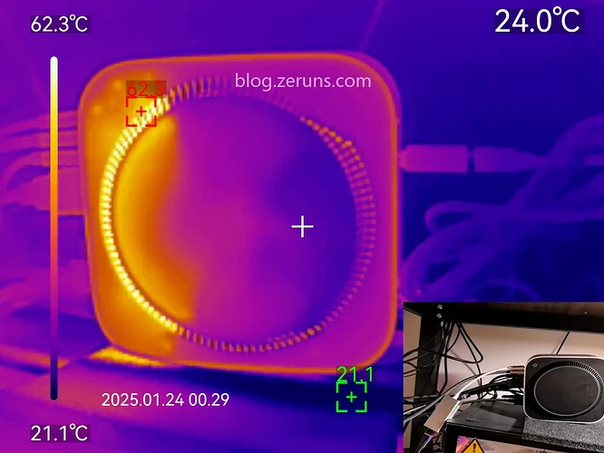 CPU跑满(XMR挖矿)半小时后底面热成像图,出风口最高温度62.3度(环境温度21度),从热成像图可以看出确实是三面进风一面出风的。
