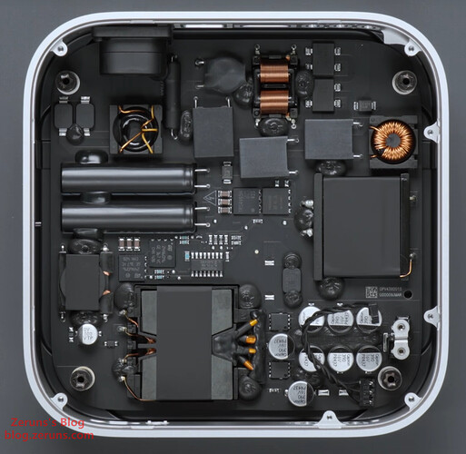紧凑的机身,意味着新款 Mac mini 不再像前代一样,能拥有更多内部空间用于被动散热,苹果为其设计了一个全新的散热方案:风扇靠近机身正面,出风口靠近背面,空气从底部被吸入,在机身内部循环后被排出。
