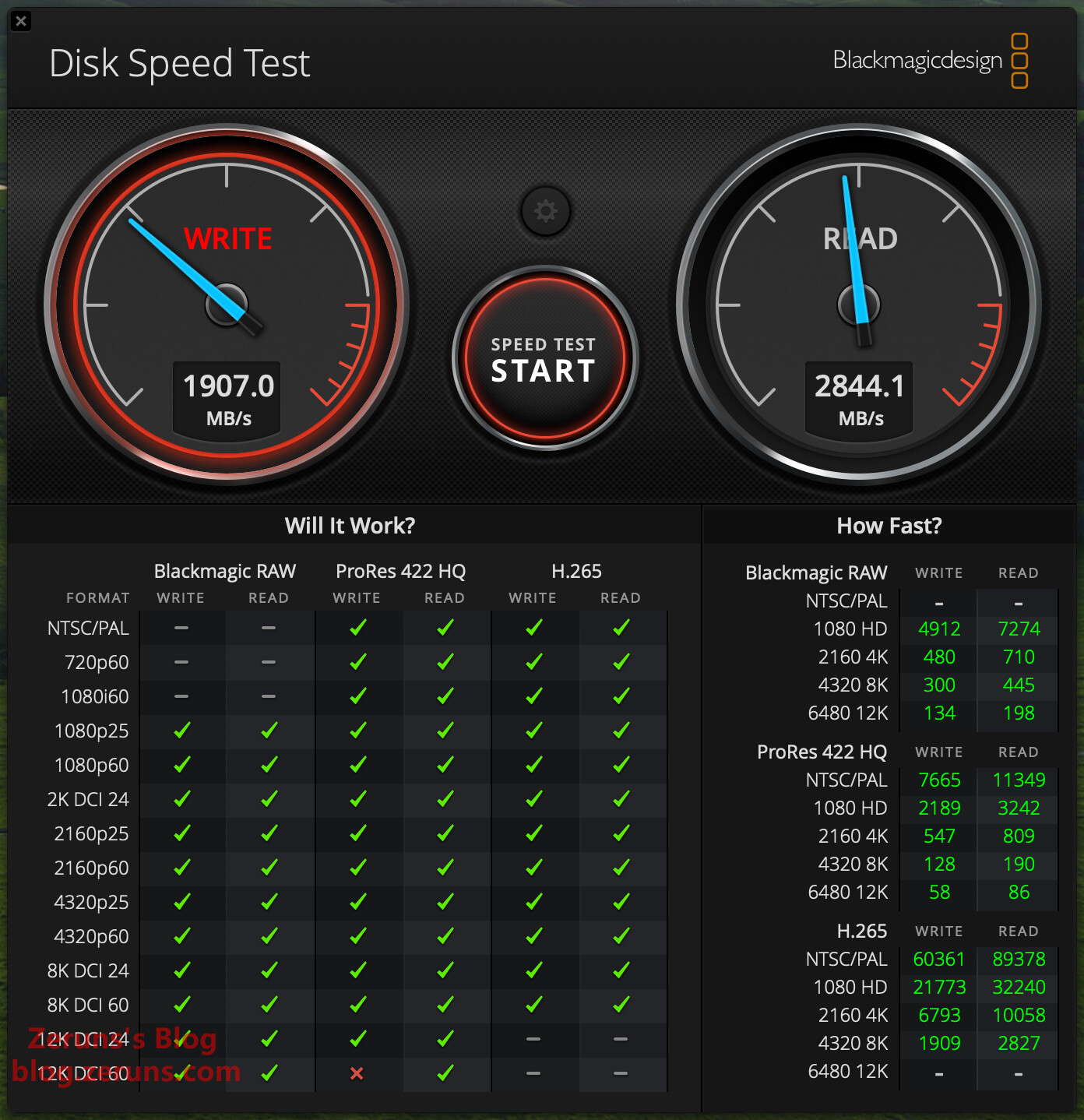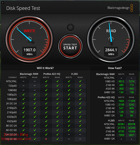 使用 Disk Speed Test Blackmagicdesign 软件测试MacMini内置硬盘的读写速度,写入速度1907MB/s,读取速度2844.1MB/s