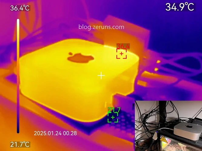 CPU跑满(XMR挖矿)半小时后正面热成像图,最高点温度36.4℃(环境温度21℃),外壳摸上去温温的,不烫手,表现很不错。