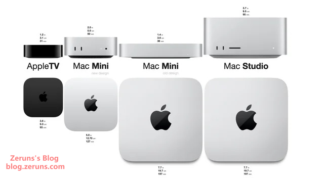 新旧放在一起对比,Mac Mini 2024 仍采用圆角设计,但其 12.7 x 12.7 厘米的占地面积比前代产品(20 x 20 厘米)更加紧凑。新款 Mac Mini 的尺寸只比 Apple TV 大一点。