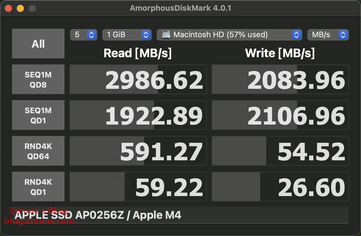 使用 AmorphousDiskMark 软件测试MacMini内置硬盘的读写速度,顺序写入速度2083.96MB/s,顺序读取2986.62MB/s,单线程4K随机读速度59.22MB/s,单线程4K随机写速度26.6MB/s