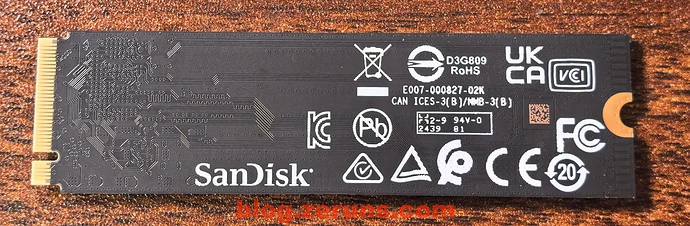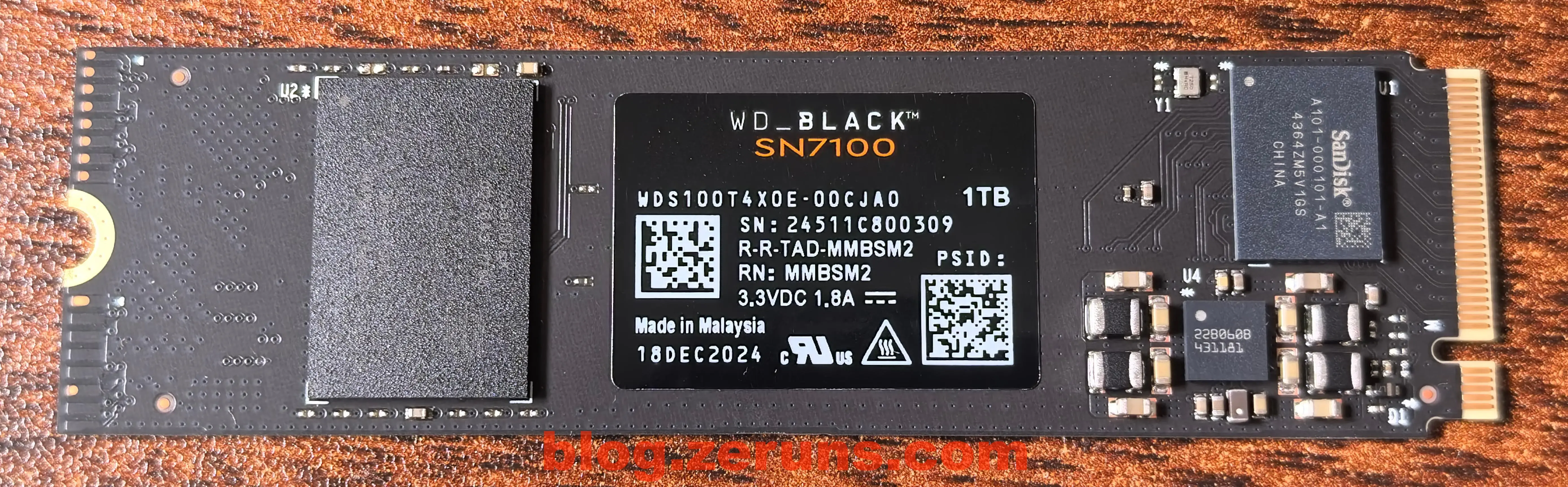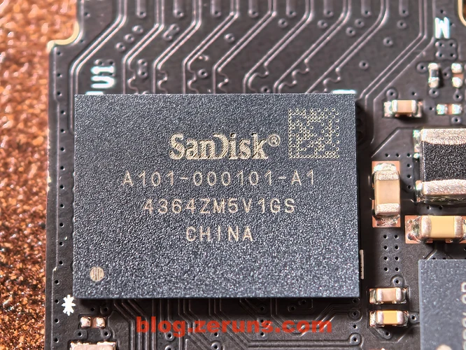 主控型号是 SanDisk A101-000101-A1 ,是西部数据的最新自研主控 Polaris 3 A101-000101-A1 ,该主控为DRAM-less 无缓设计,支持 PCIe Gen4 x4、NVMe 2.0,处理器采用多核心架构 TSMC 16nm 制程的 ARM Cortex-R处理器。