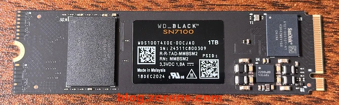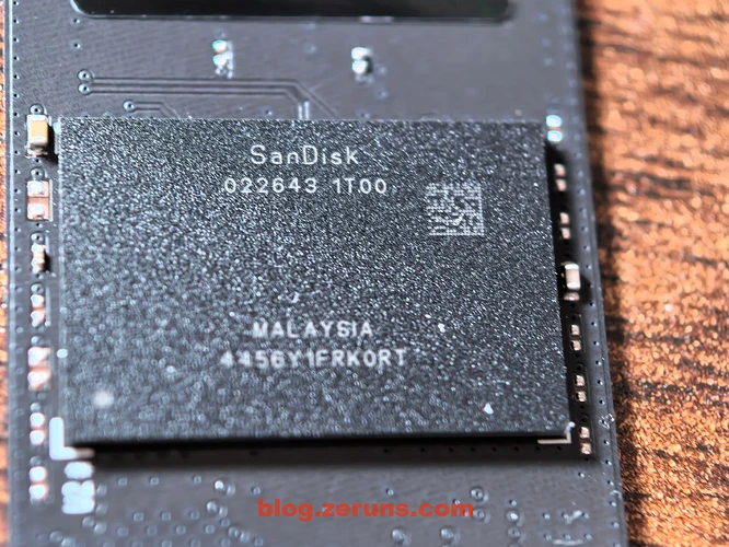 闪存颗粒型号是 SanDisk 022643 1T00 ,是西部数据(Western Digital)旗下品牌闪迪(SanDisk)推出的最新一代 3D NAND TLC 闪存颗粒,该颗粒单颗容量为1TB,采用闪迪原厂最新的218层3D闪存技术,通过创新的横向收缩技术将位密度提升了约50%。其NAND I/O速度超过3.2Gb/s,相比前代产品SN770提升了约60%,同时写入性能和读取延迟改善了约35%。颗粒支持NVMe 1.4及更高标准的NVMe 2.0协议,兼容PCIe 4.0 x4接口。在HMB(Host Memory Buffer)技术加持下,可实现最高7250MB/s的顺序读取速度和6900MB/s的顺序写入速度,随机读写性能分别达到1000K IOPS和1400K IOPS。此外,其功耗和发热控制表现优于前代产品。