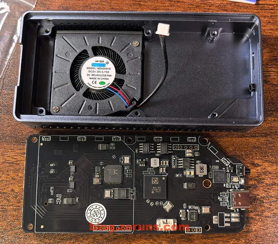 拧下电路板上的6颗十字螺丝,拆下硬盘盒电路板,外壳上固定有一个散热风扇,风扇是3线的,应该是可以调速的。
