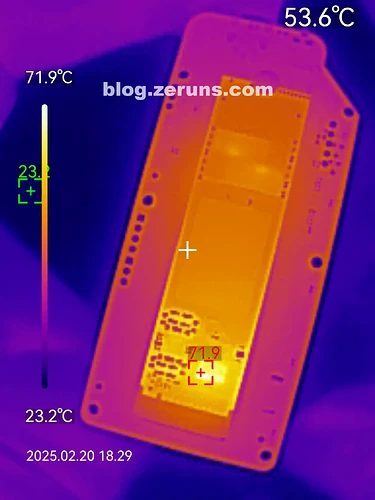 读写跑满时硬盘正面热成像图如下,主控最高温度72℃左右(环境温度24度左右)。主控发热较大,闪存颗粒几乎不怎么发热。