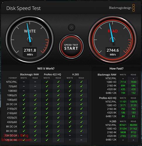 硬盘盒接 致钛TiPro7000硬盘 在 Mac mini 主机上插40Gbps的C口,数据走的 JHL7440 主控,用 Blackmagicdesign Disk Speed Test 软件测速,顺序读取速度 2744.6MB/s,顺序写入速度 2781.8MB/s。