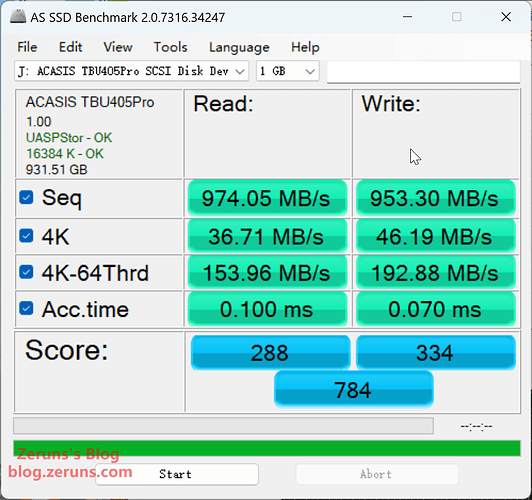 硬盘盒接 西数SN7100硬盘 在Win主机上插20Gbps的C口,数据走的RTL9210主控,连接速度10Gbps,不支持20Gbps,用 AS SSD Benchmark 软件测速,顺序读取速度 974.05MB/s,顺序写入速度 953.3MB/s,单线程4K随机读速度 36.71MB/s,单线程4K随机写速度 46.19MB/s。