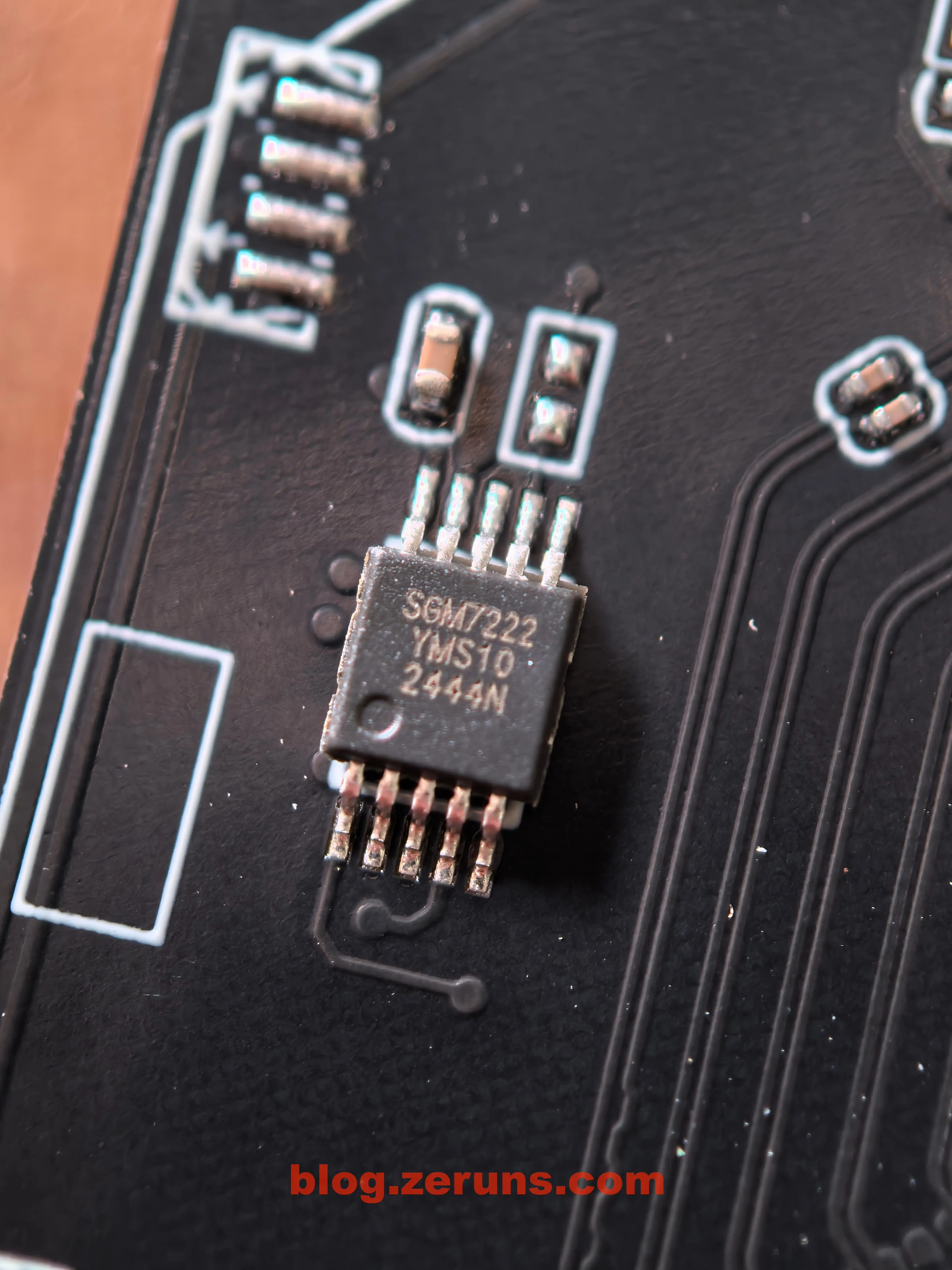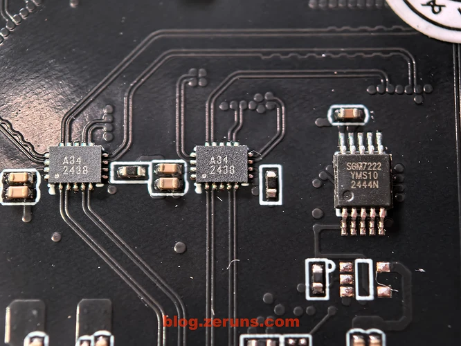 主控下面有两颗丝印为 A34 2438 的芯片,没查到资料。旁边还有一颗型号为 SGM7222 的芯片,这个芯片在电路板上有3颗,是圣邦微电子(SGMicro)推出的一款高速、低功耗双刀双掷(DPDT)模拟开关芯片,主要用于电子设备中的信号切换。