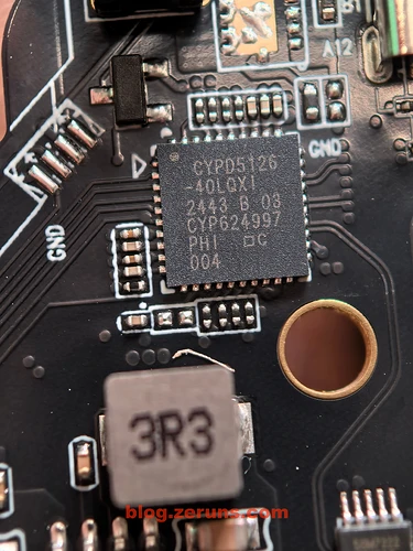 USB-C口旁边有一个型号为 CYPD5126-40LQXI 芯片,是赛普拉斯(Cypress)公司推出的一款高性能接口集成电路(IC),专为 USB Type-C 和 Power Delivery(PD)应用设计。这款接口IC具有丰富的功能,为现代电子产品提供了多种连接和供电解决方案。简单说就是C口的电源管理芯片。