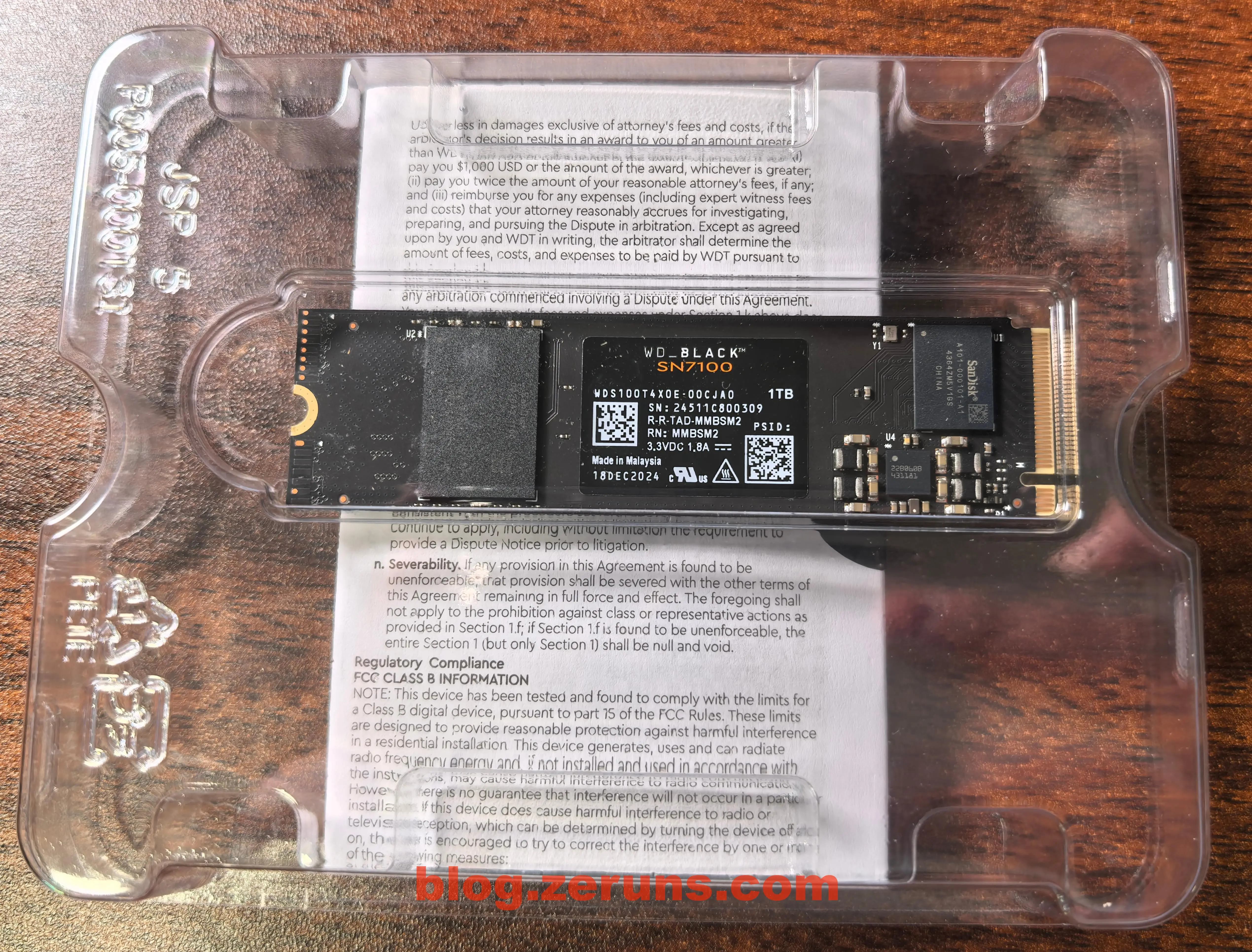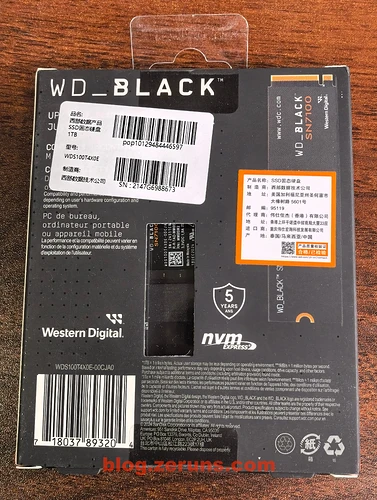 外包装背面,标签写着制造商是西部数据技术公司,型号是 WDS100T4X0E