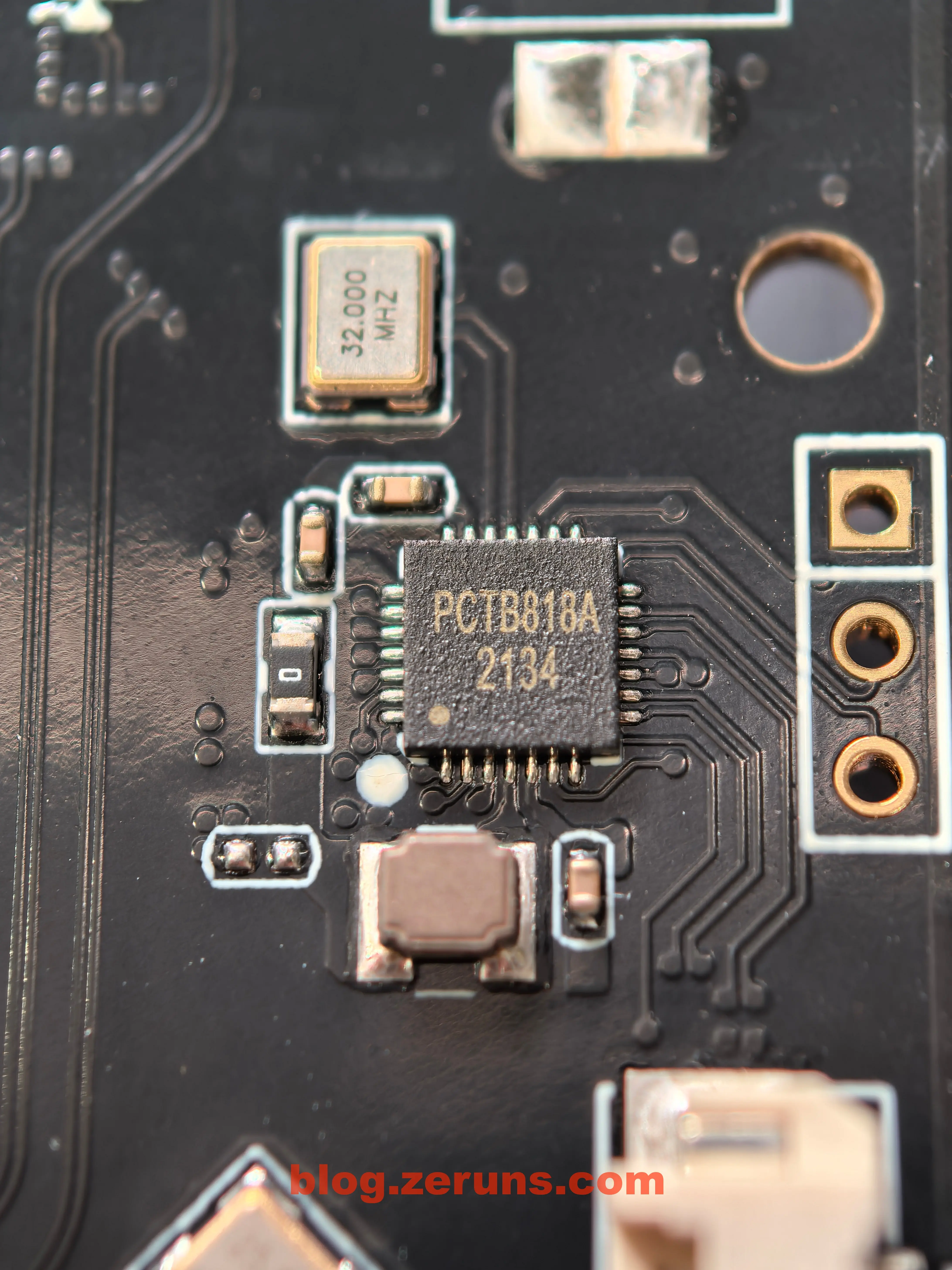 风扇接口旁边有一个型号为 PCTB818A 的芯片,没查到资料,接了个32MHz的晶振,疑似是一个单片机集成DCDC电源和风扇控制相关的?