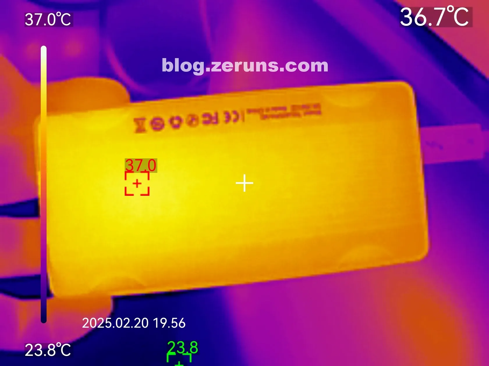 硬盘盒读写跑满时外壳正反面热成像图如下,外壳在37度左右(室温24℃左右)。