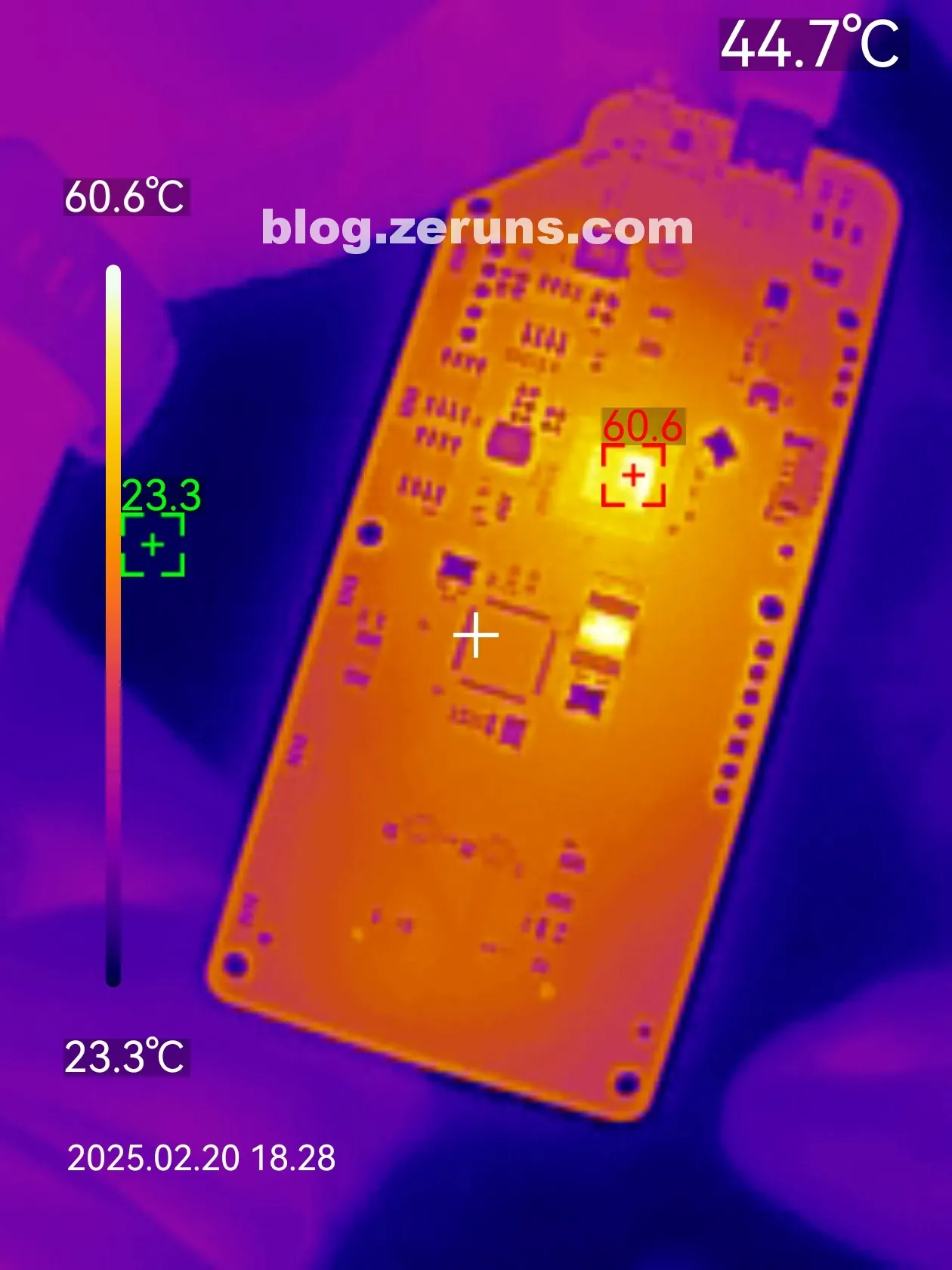 JHL7440 主控工作时满载(读写跑满)发热情况热成像图如下,芯片温度60度左右(室温24℃左右)。