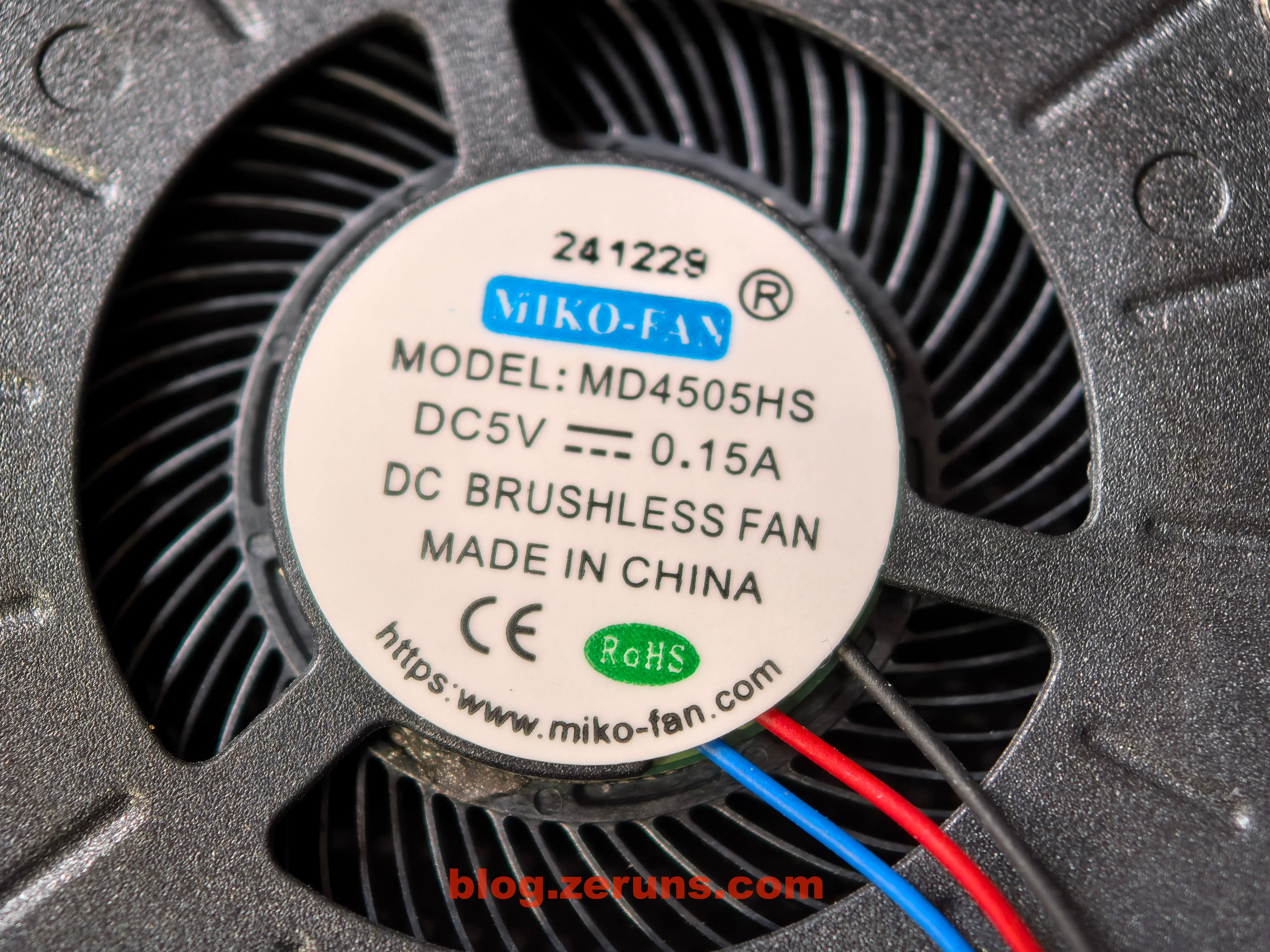 散热风扇品牌是 MIKO-FAN(深圳市米克罗电子科技有限公司),型号为 MD4505HS,额定电压电流为 5V / 2A