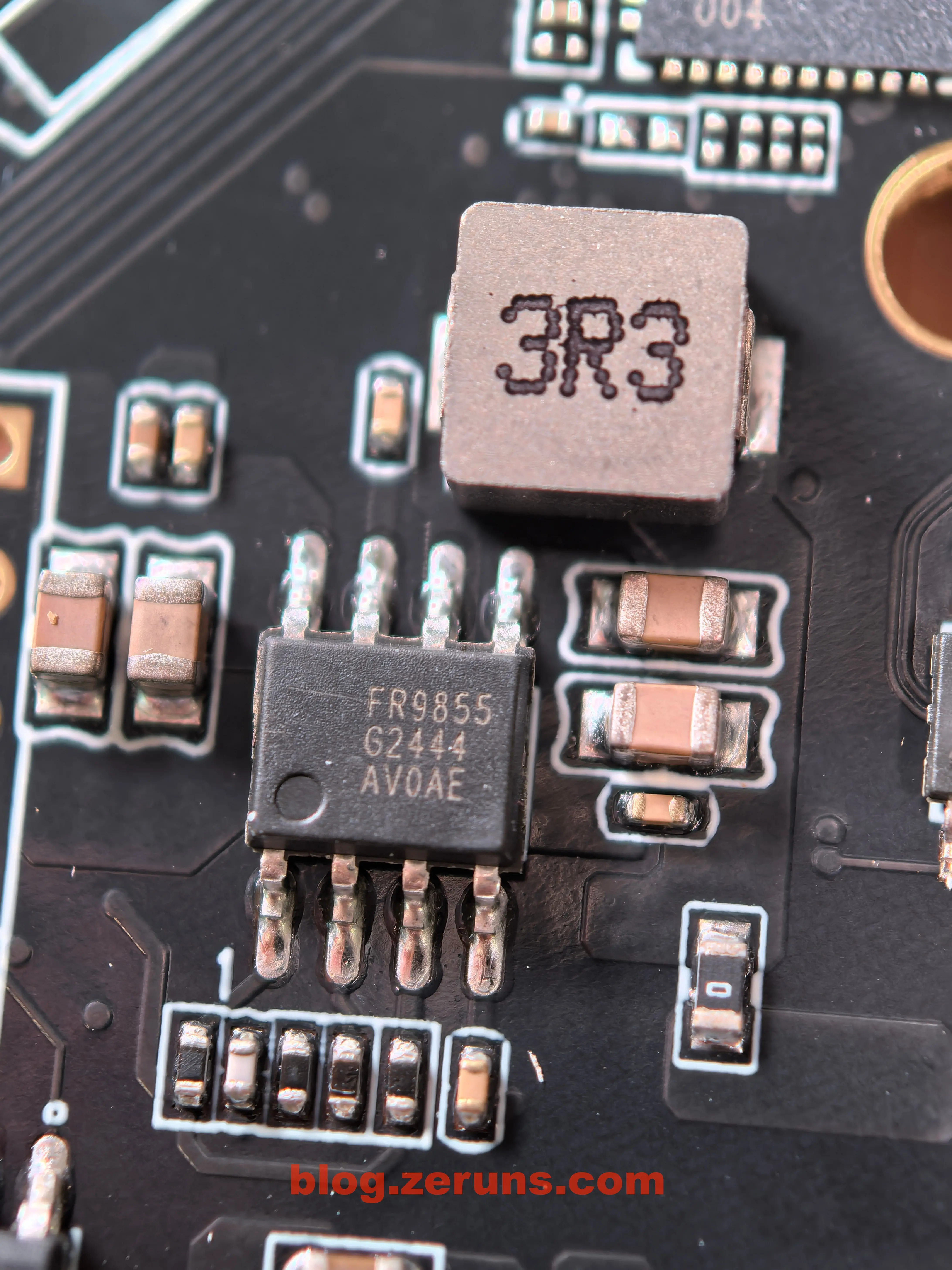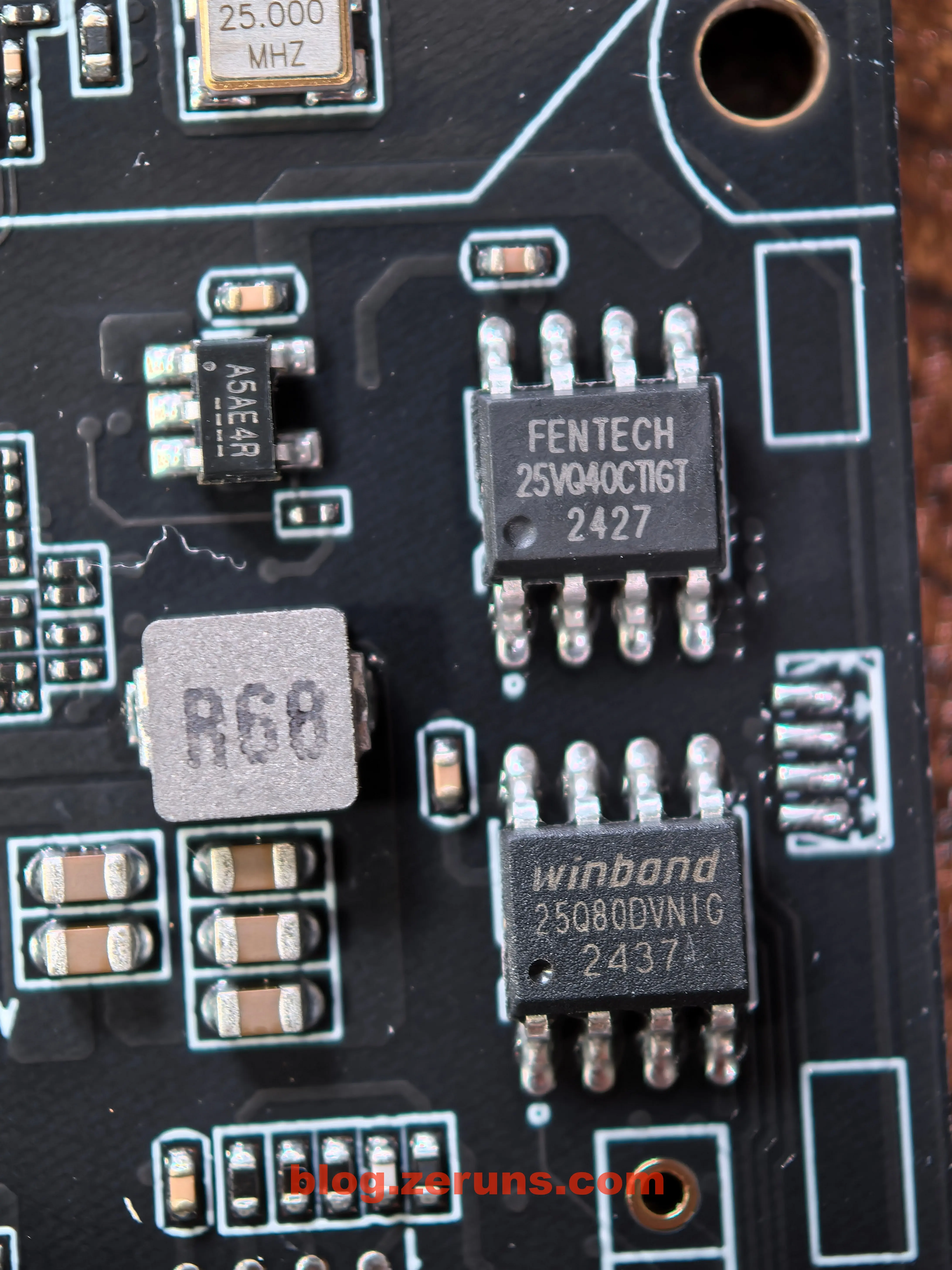 主控旁边还有两颗型号分别为 FENTECH 25VQ40CTIGT 和 winbond 25Q80DVNIC 的存储芯片,应该是分别用于存储两个主控芯片的固件的。旁边还有一个丝印为 A5AE4R 的芯片,旁边有个电感,应该是DCDC电源芯片。