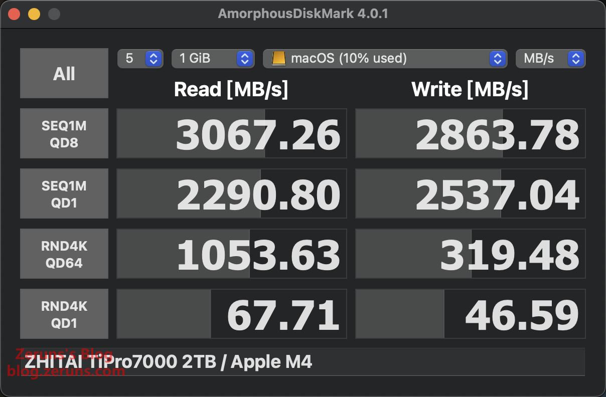 硬盘盒接 致钛TiPro7000硬盘 在 Mac mini 主机上插40Gbps的C口,数据走的 JHL7440 主控,用 AmorphousDiskMark 4.0.1 软件测速,顺序读取速度 3067.26MB/s,顺序写入速度 2863.78MB/s,单线程4K随机读速度 67.71MB/s,单线程4K随机写速度 46.59MB/s。(这个时候macOS系统已经迁移到这个外置硬盘里了)