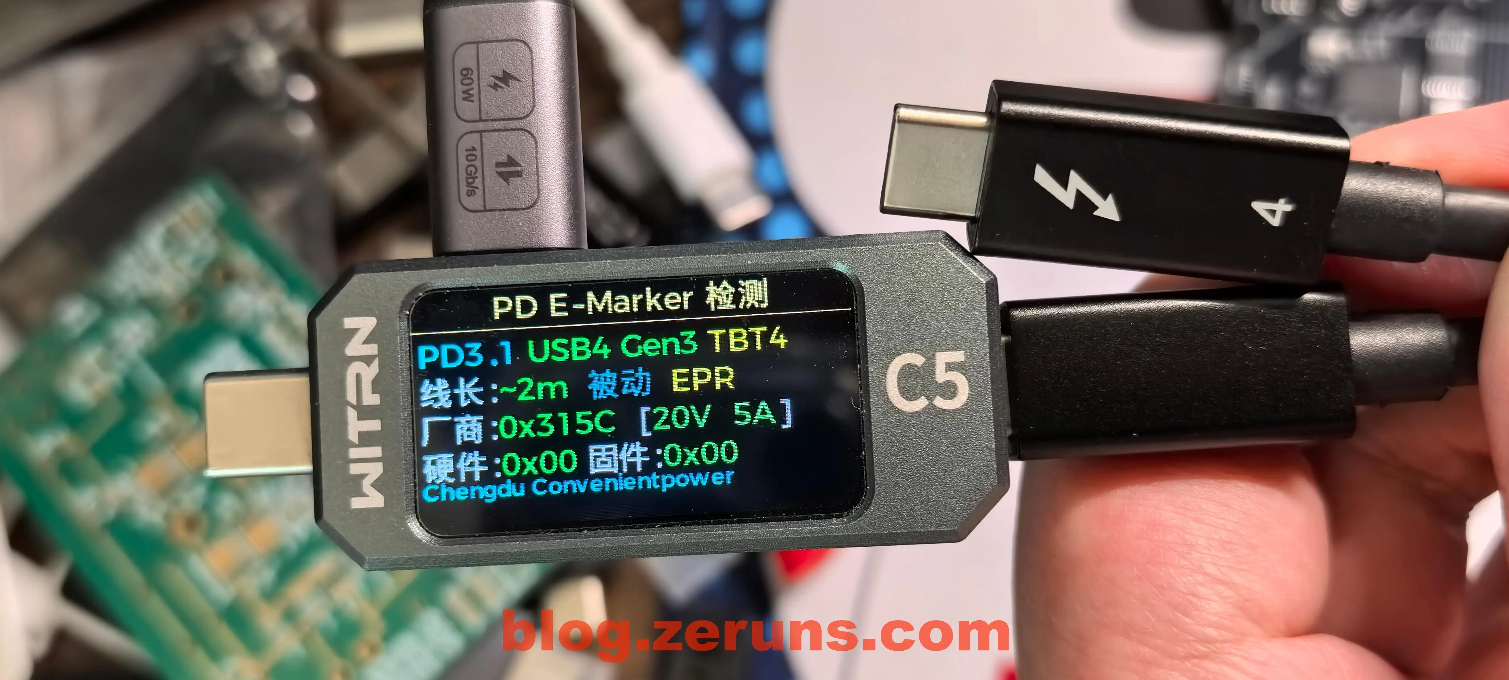 使用 维简C5检测仪 读取硬盘盒附赠的数据线的E-Marker信息,信息显示该数据线支持 USB4 Gen3 / TBT4(雷电4),厂商代码0x315C,支持PD3.1 EPR 20V 5A。