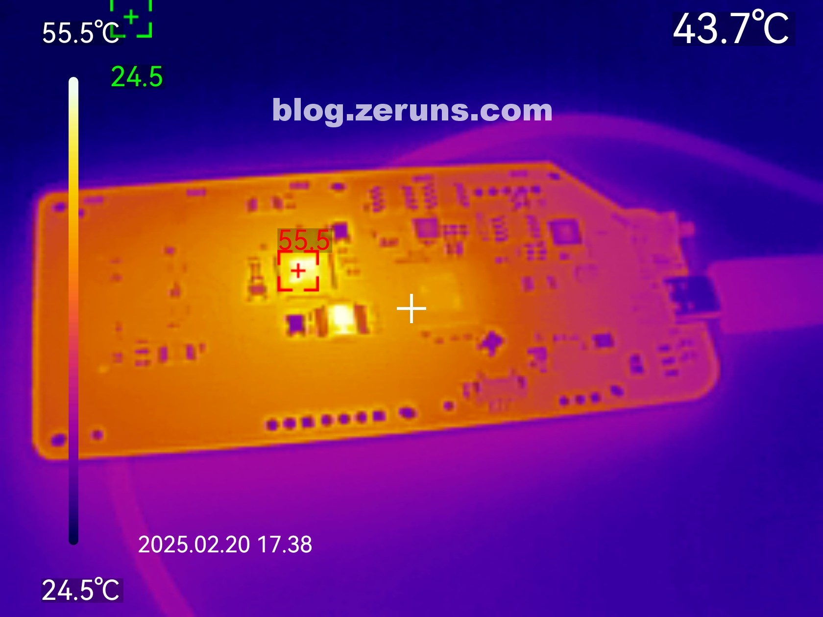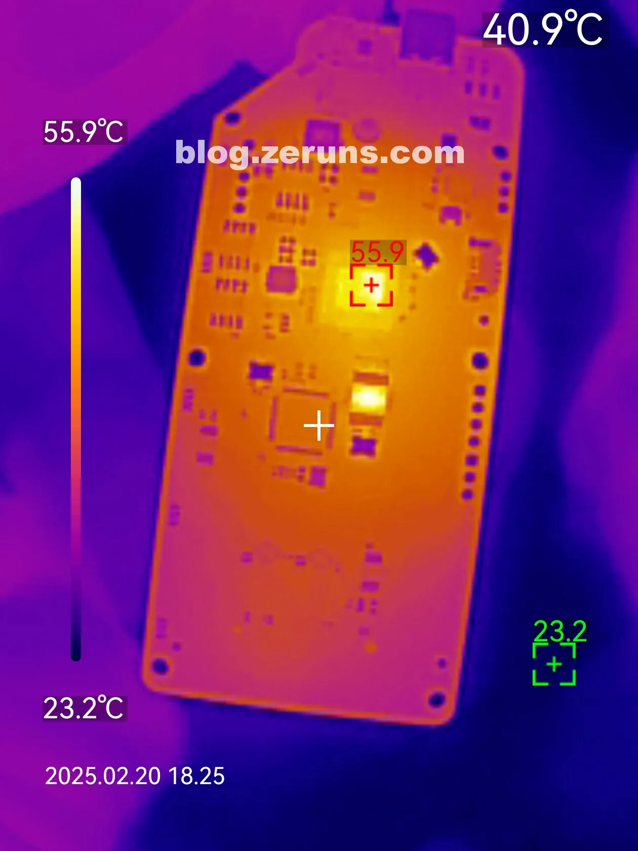 RTL9210 主控工作时空载(没有进行数据读写操作)发热情况热成像图如下,芯片温度55度左右(室温24℃左右)。