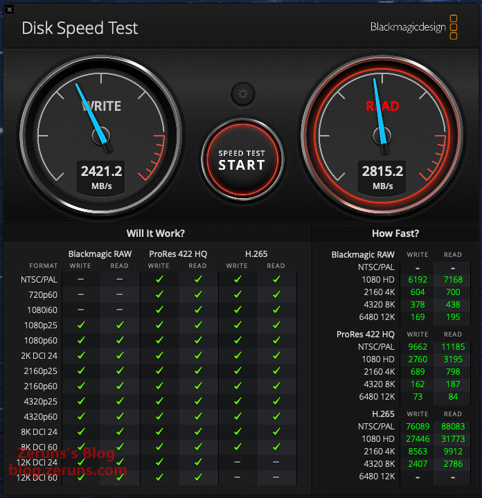硬盘盒接 西数SN7100硬盘 在 Mac mini 主机上插40Gbps的C口,数据走的 JHL7440 主控,用 Blackmagicdesign Disk Speed Test 软件测速,顺序读取速度 2815.2MB/s,顺序写入速度 2421.2MB/s。