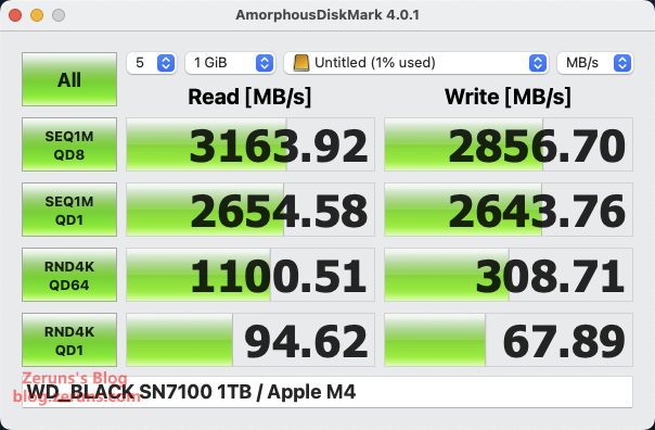 硬盘盒接 西数SN7100硬盘 在 Mac mini 主机上插40Gbps的C口,数据走的 JHL7440 主控,用 AmorphousDiskMark 4.0.1 软件测速,顺序读取速度 3163.92MB/s,顺序写入速度 2856.7MB/s,单线程4K随机读速度 94.62MB/s,单线程4K随机写速度 67.89MB/s。