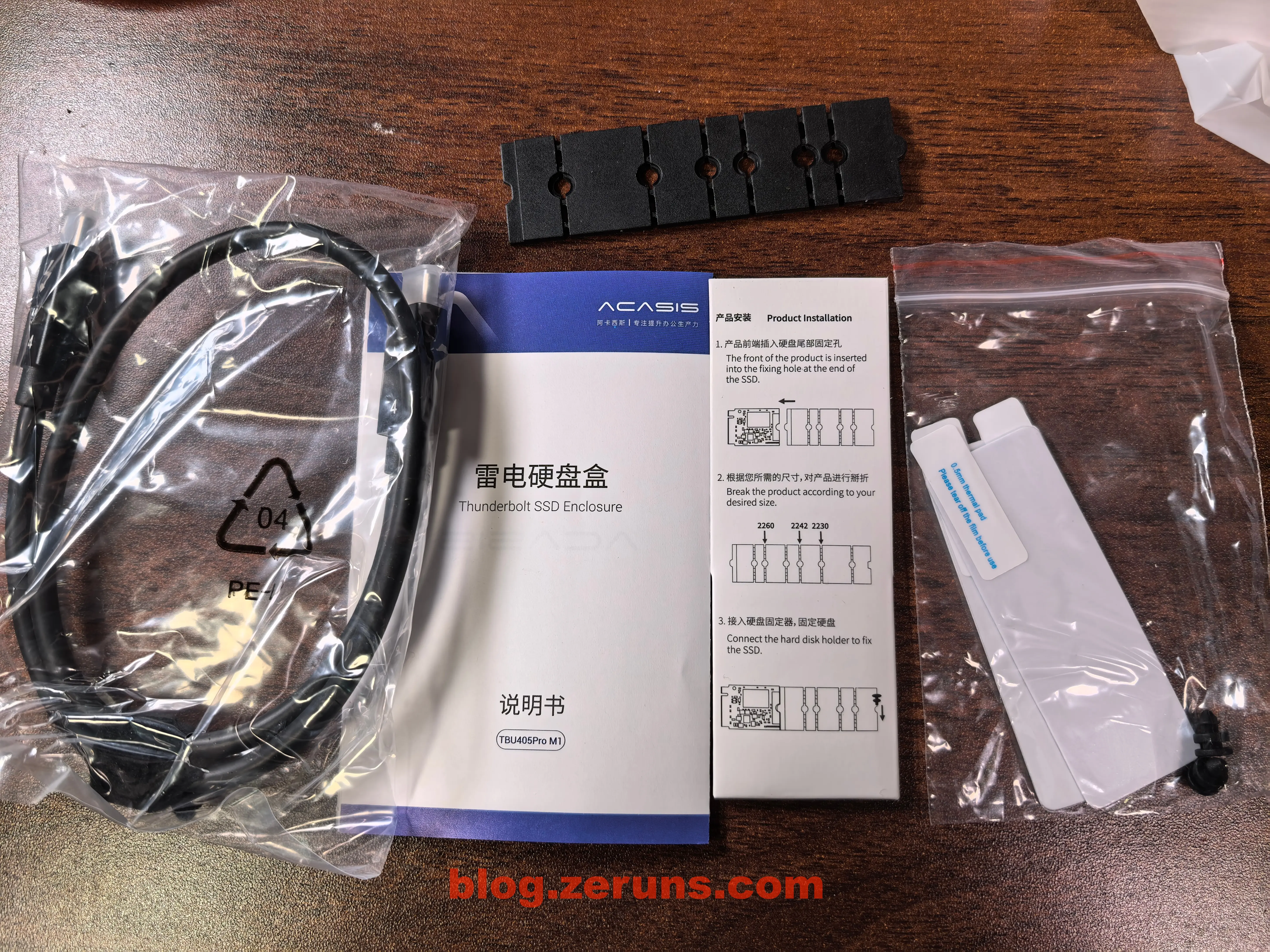 打开外包装,里面有 硬盘盒、CtoC的雷电4数据线、说明书、两个导热垫、胶钉(用于固定硬盘)、小规格硬盘转2280长度的塑料板。