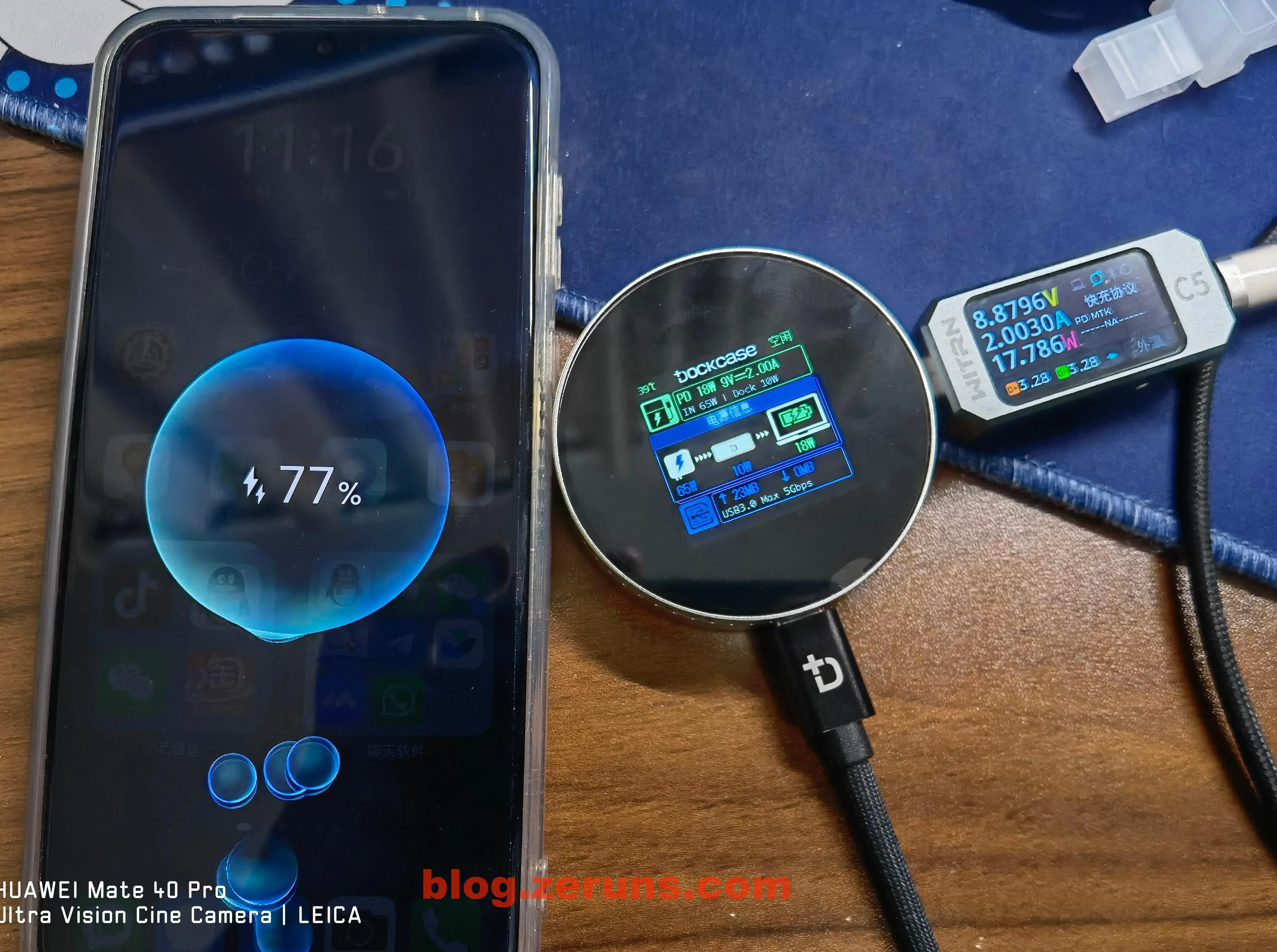 ハードディスクケースには2つのCポートがあり、片方をスマホ、もう片方をPD充電器に接続することで、充電しながら読み書きが可能。ただし、HuaweiスマホのPD対応最大出力は18Wのため、100W PDのテストはできない。