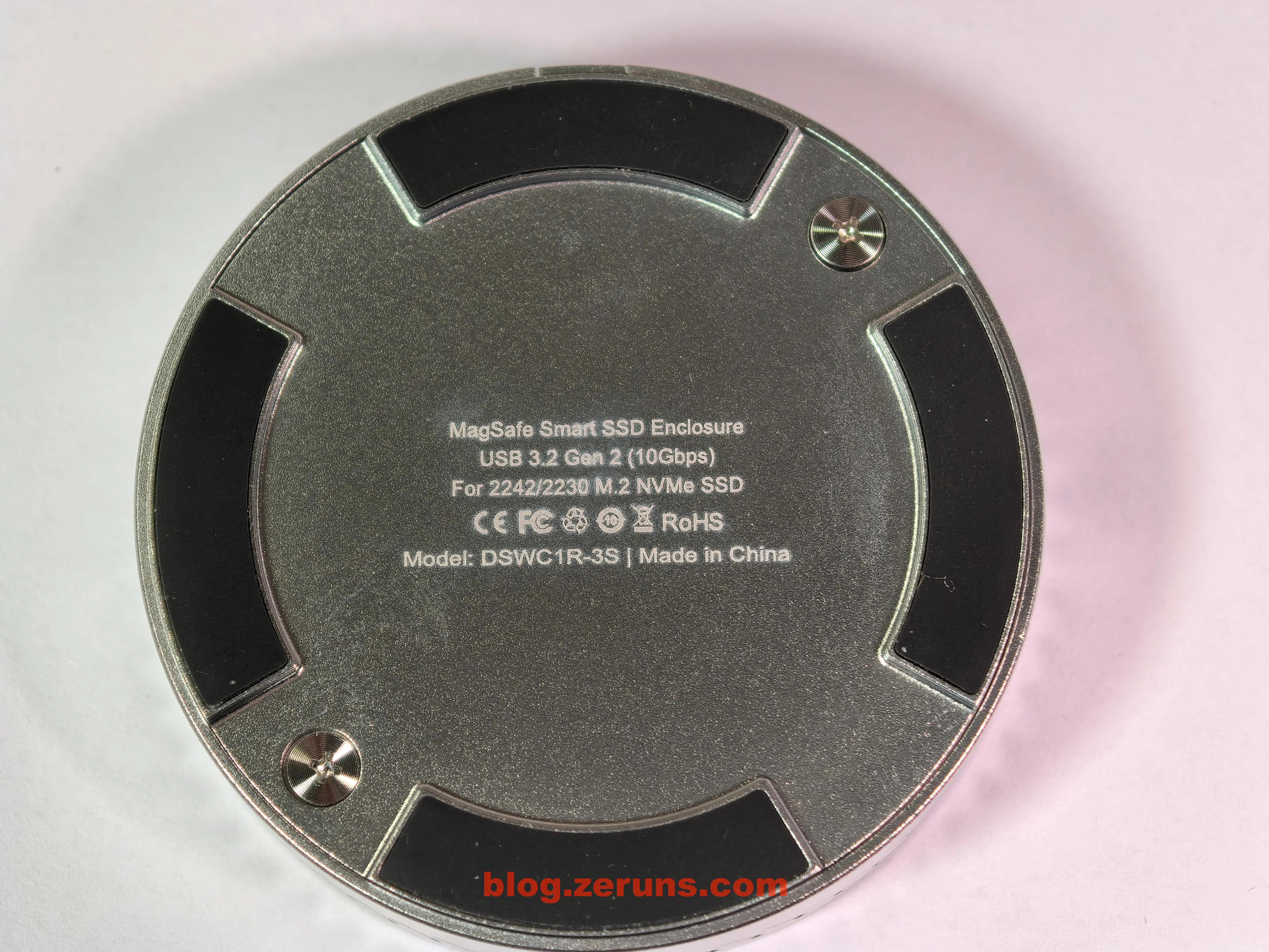 ハードディスクケース底面。型番が印刷されており、滑り止め用の脚ゴム(磁石は脚ゴム内)がある。
