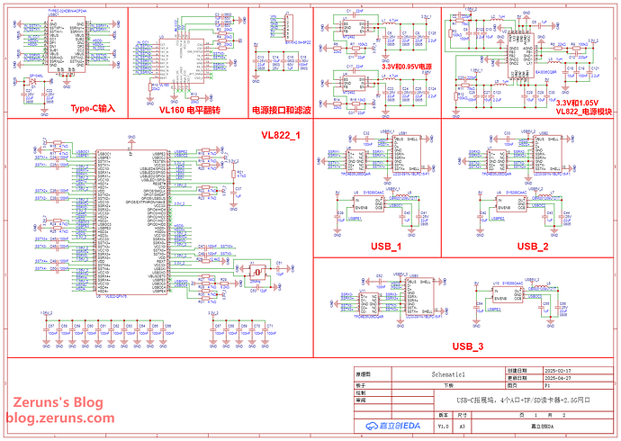 Open-sourcing a USB3.2 expansion dock with Type-C input: 4 USB3.2 Gen2 ports + 2.5G Ethernet + TF/SD card readers, supports PD fast charging for auxiliary power, input voltage range 4 to 20 V, Buck-Boost circuit regulating output to 5.1 V, based on VL160 + VL822 + RTL8156BG + GL3224 chips.