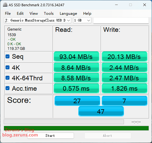 Tested with a Samsung EVO Plus TF card: 93.04 MB/s read, 20.13 MB/s write.
