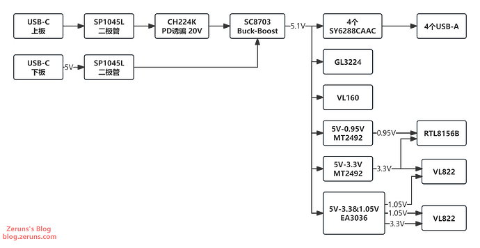The 5 V power supply section uses a Buck-Boost converter to regulate output to 5.1 V (the extra 0.1 V compensates for voltage drop under high current). There are two Type-C inputs: one is a data port (also accepts power but doesn’t trigger fast charging—it only accepts 5 V and is routed through the converter to prevent voltage sag under heavy load), and the other is a power port (supports PD fast charging by negotiating 20 V output, then stepping down via the converter to 5.1 V). The 5 V supply can deliver up to 9.5 A in total, with each USB-A port supporting up to 2 A.