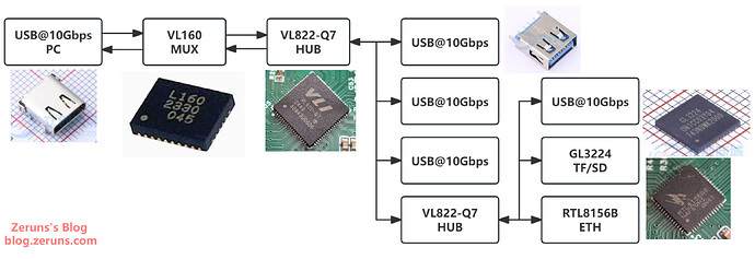 In this scenario, the USB data line first passes through the VL160 level-flip chip (enabling reversible Type-C insertion). The flipped USB signals are then sent to the VL822 hub chip, which splits one USB input into four USB outputs.