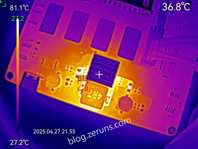 MOSFET temperature ~81 °C when the 5 V power circuit delivers 8 A (ambient ~27 °C)