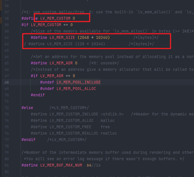 MCU에 SPI/PSRAM 인터페이스가 있는 경우(예: ESP32-S3, F1C200S), LV_MEM_CUSTOM를 활성화하고 lv_mem_alloc을 PSRAM로 리다이렉트하여 LVGL이 ‘무한’ 메모리가 있는 것처럼 인식하게 하면 240×240 TRUE_COLOR도 구동할 수 있습니다.