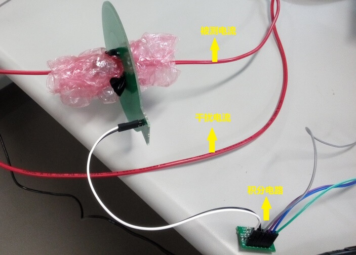 Limited by the inability to provide large interference current at the test site, to achieve better interference effects, the measured current did not have increased turns, and the interference current was made comparable in magnitude to the measured current. As compensation for the turns, the amplification factor of the integrator circuit was increased in the interference testing (R7 in Figure 15 was changed to 100Ω). It should be noted that an excessively large amplification factor brings some disadvantages, such as increased output offset, and increased deviation between the actual gain and design value of the amplification factor. Therefore, a large amplification factor should not be selected in practical applications. However, in this anti-interference testing, we are more concerned about the impact of interference signals on measured signals with a fixed circuit, so the impact of larger gain is not significant.