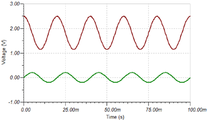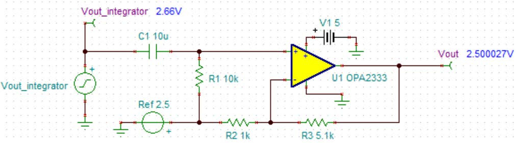From the previous circuit analysis, the voltage offset at the output has some error, which for OPAx333 op-amps is at most a few mV (while poorer op-amps could reach hundreds of mV). If higher offset requirements are needed at the output, the offset must be corrected. The correction circuit is placed after the integrator circuit, as shown in Figure 11. The simulation results show that the DC offset at output Vout differs from the preset Ref value by only 27µV, demonstrating excellent offset performance. Meanwhile, the non-inverting gain resistors R2 and R3 can further condition the signal to achieve full swing.