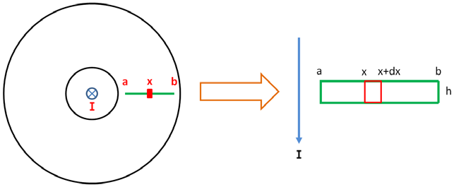 Assume an infinitely long current-carrying conductor passes vertically through the center of a Rogowski coil, with conductor current I. The coil inner diameter is a, outer diameter is b, board thickness is h, and the permeability of the PCB trace is μ. As shown in Figure 2.