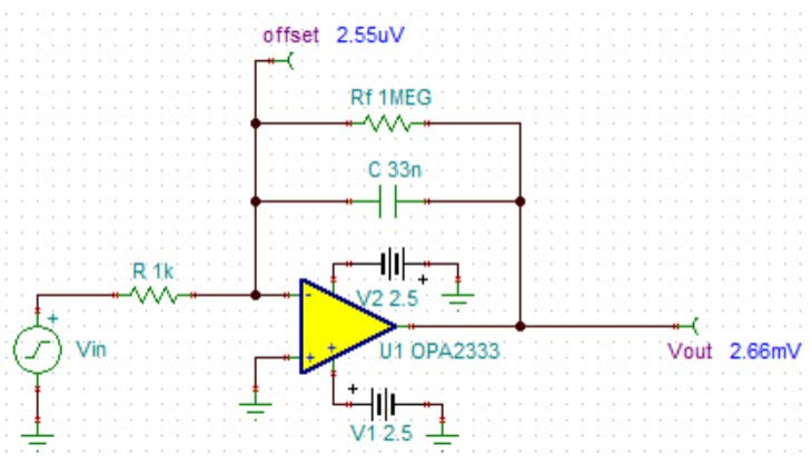 To achieve good integration performance, the feedback resistor Rf generally needs to be selected as large as possible, but not excessively large. The main reason is that the integrator circuit acts as a non-inverting amplifier for the op-amp offset. An excessively large feedback resistor Rf will result in a large DC offset at the output, weakening the integrator drift suppression capability. Therefore, the op-amp in the integrator circuit should have a very small offset value to ensure the DC level at the output is as low as possible. OPAx333 is a low-offset op-amp with Zero Drift functionality introduced by TI, which uses internal digital calibration to significantly reduce offset and drift voltage. Its maximum offset is only 10µV, with drift as low as 0.05µV/°C, making it very suitable for integrator circuit design. Figure 8 shows the DC simulation of the OPA2333 integrator circuit. It can be seen that even when the feedback resistor is 1000 times the integrator resistor, the output is only 2.66mV, demonstrating excellent performance. Additionally, OPAx333 has a maximum quiescent current of only 25µA, making it a low-power, high-performance operational amplifier.