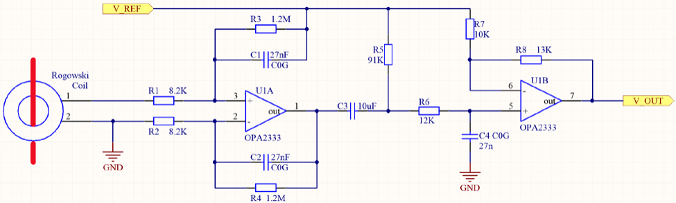 In some applications (such as AFCI), users are primarily concerned with the high-frequency fault components of current to take appropriate actions (such as circuit interruption) under fault conditions. In these cases, the low-frequency normal operating current is less important and can even be ignored. For this application scenario, a high-pass filter can be set up first to filter out low-frequency components. Then an amplifier circuit can be added to amplify the high-frequency components, ensuring the integrated signal is sufficient to be monitored. The application circuit is shown in Figure 12.