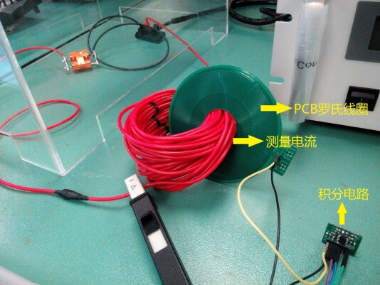 Figure 16 Left shows test environment, right shows measurement waveform (purple trace is current, yellow trace is integrator output voltage)