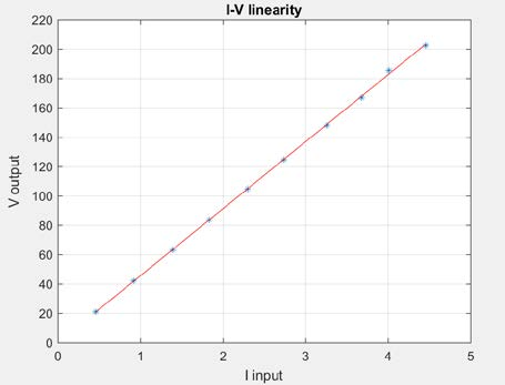 对 Table1 数据进行线性拟合,如 Figure17 所示。结果表明输出电压与输入电流的线性度非常好,近似满足如下关系式:
