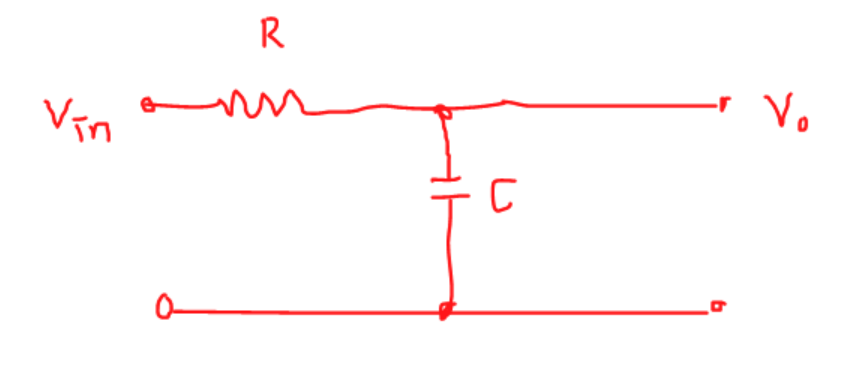 Структура схемы: входной сигнал → резистор → конденсатор → земля, выход снимается с конденсатора