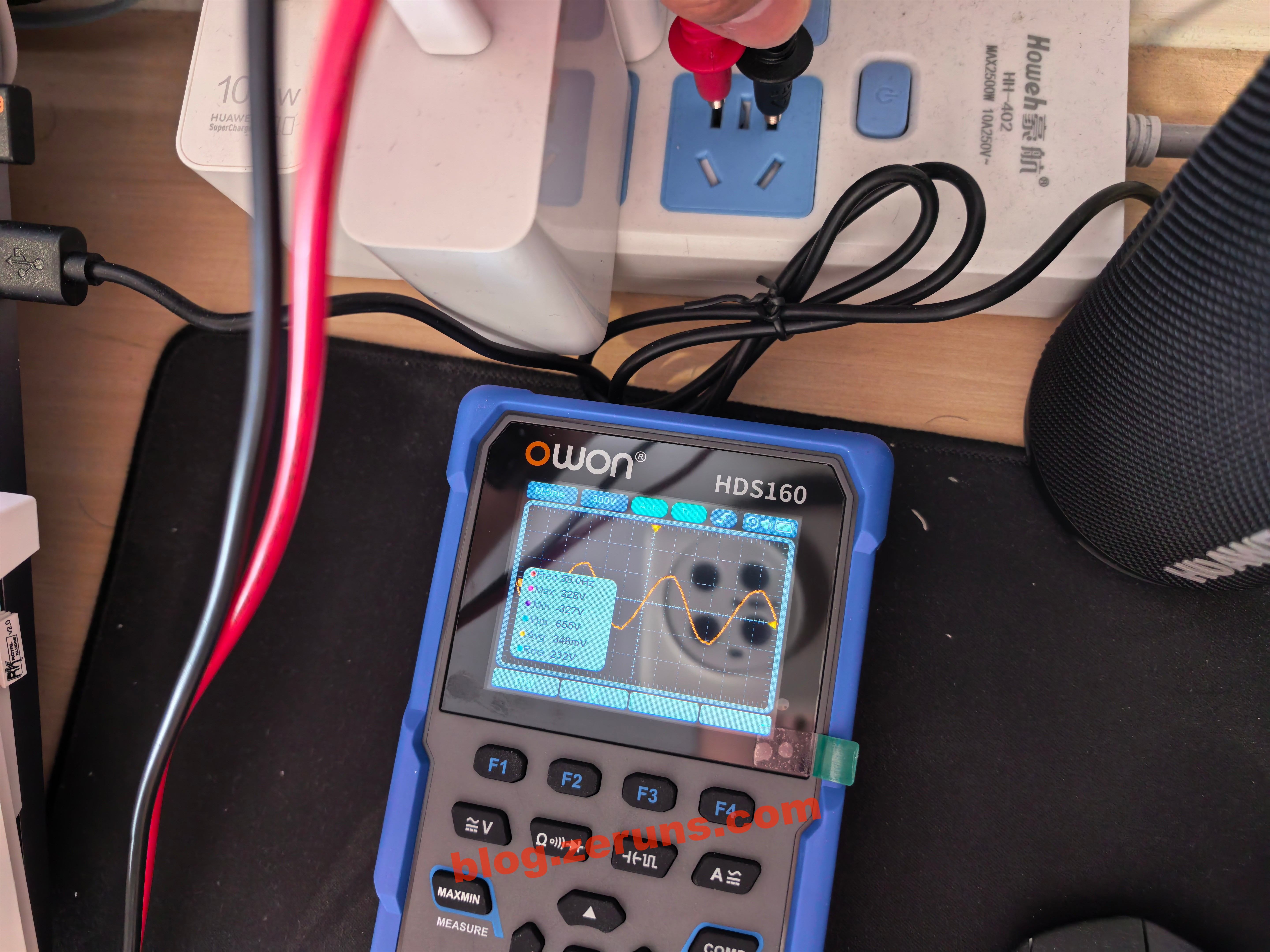 Nhấn nút DMM để vào chế độ dao động ký. Cắm que đo trực tiếp vào ổ điện xoay chiều, thu được dạng sóng điện lưới: tần số 50Hz, giá trị cực đại 328V, giá trị hiệu dụng 232V.