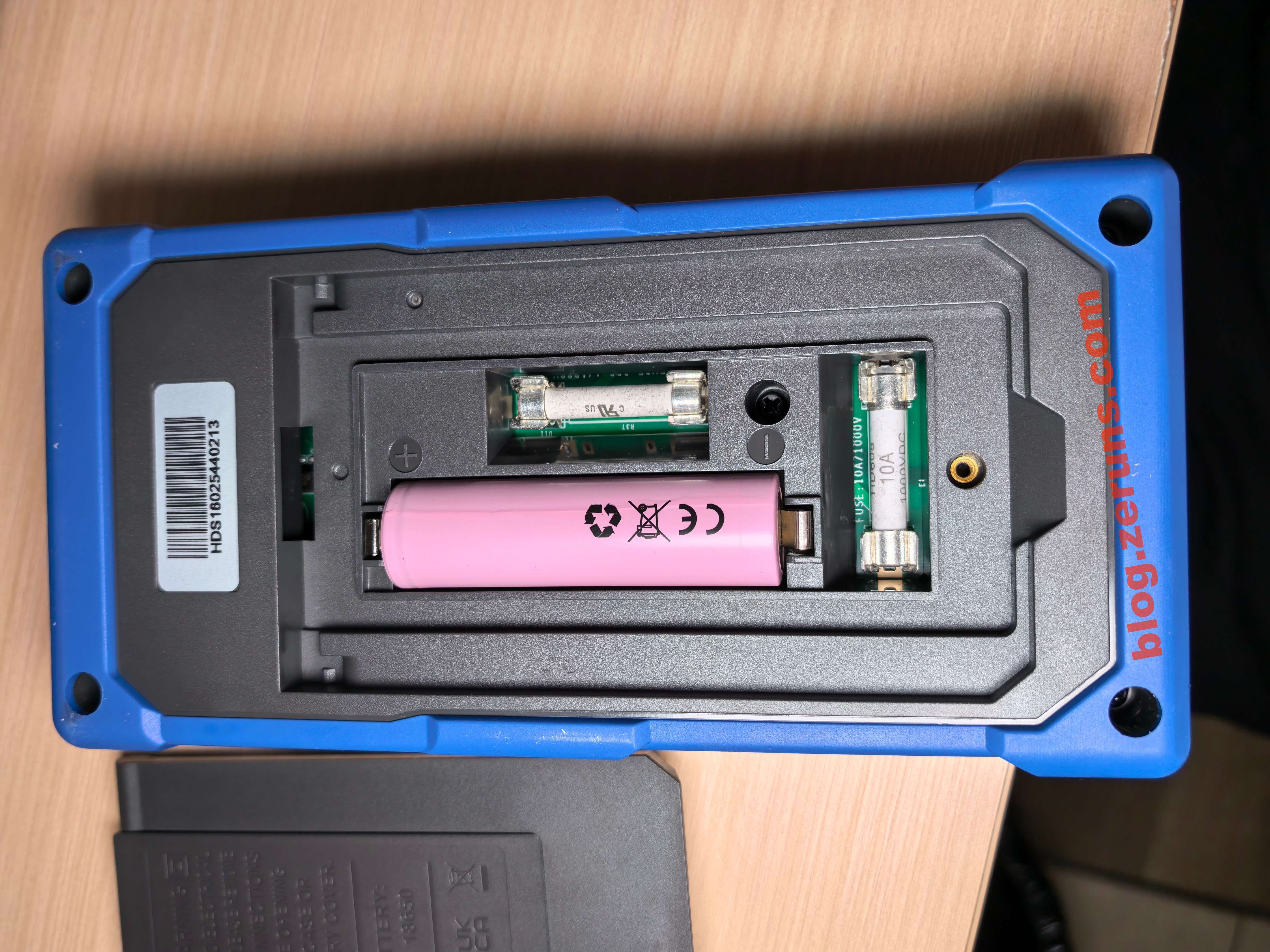 Tháo vít ở chân đế phía sau đồng hồ để tháo chân đế, sẽ thấy viên pin 18650 và hai cầu chì. Cầu chì dưới đáy pin là loại 10A, cầu chì đặt song song với pin là 600mA — có lẽ dành cho dải mA.
