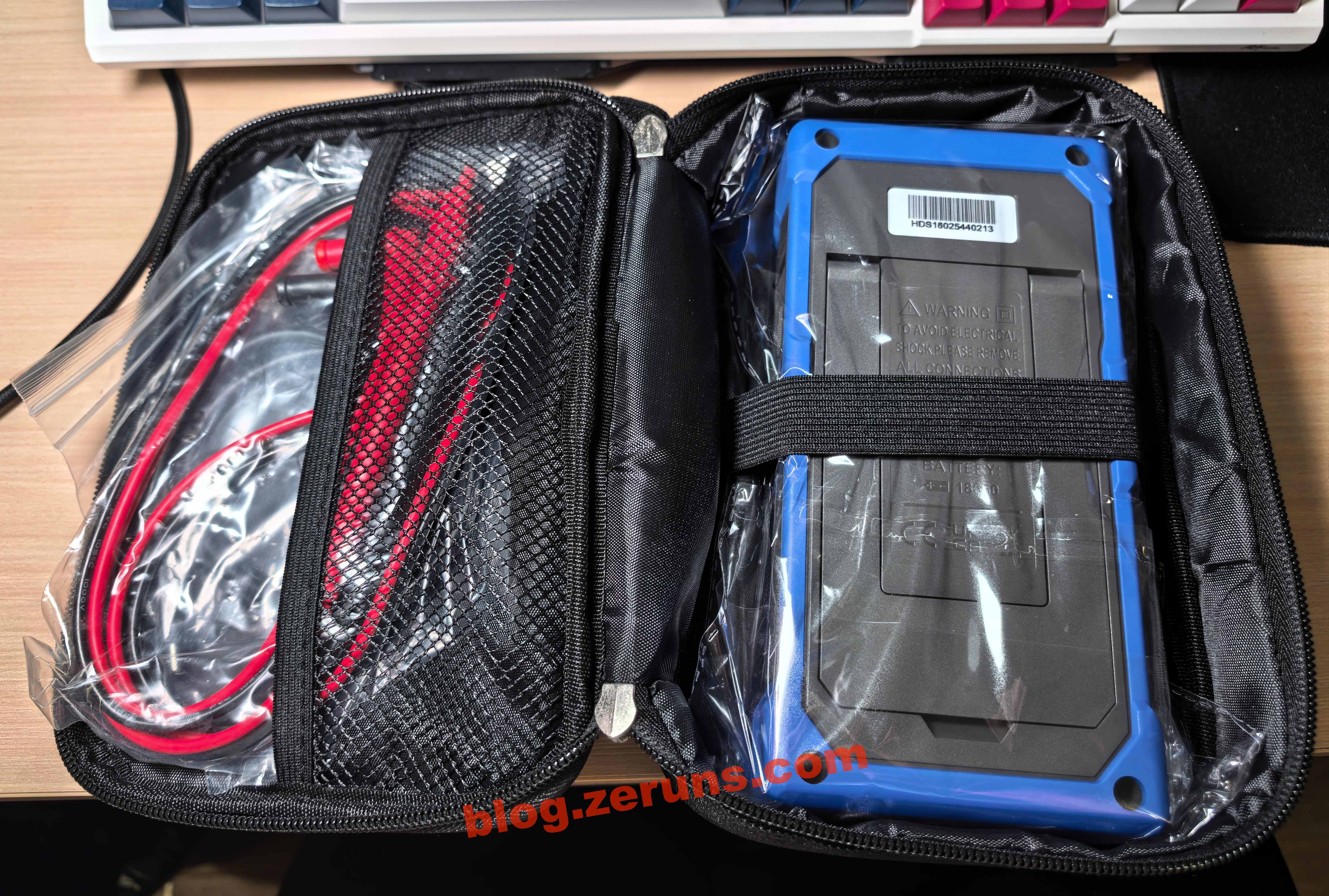 Mở túi đựng, bên trong có đồng hồ vạn năng, que đo (que thường, không phải loại đầu nhọn), và một cáp dữ liệu cổng C.